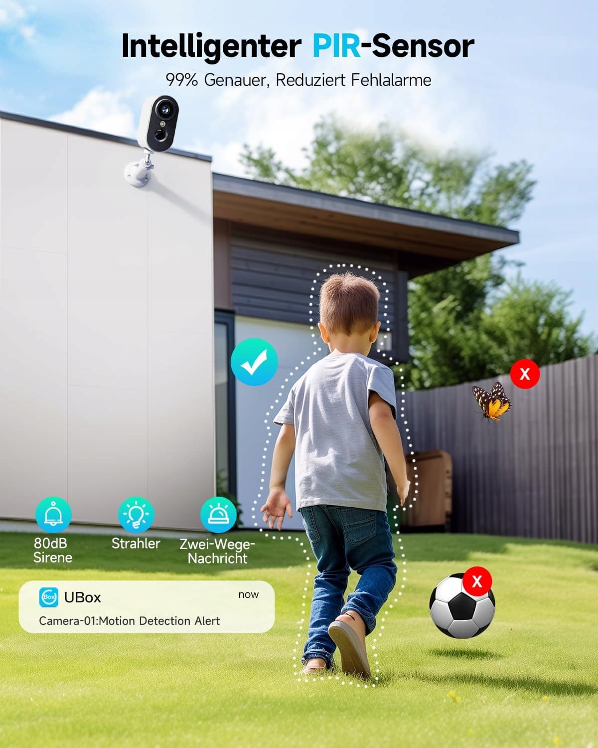 Dwukierunkowe audio i wielofunkcyjna: Bezprzewodowa kamera monitoringu zewnętrznego posiada funkcję rozmów dwukierunkowych. Wbudowany mikrofon i głośnik zapewniają płynną i wyraźną komunikację, w dowolnym czasie i miejscu. Kamera zewnętrzna obsługuje udostępnianie wielu użytkownikom. Możesz zeskanować kod przez aplikację (UBox) i pozwolić swojej rodzinie sterować kamerą.