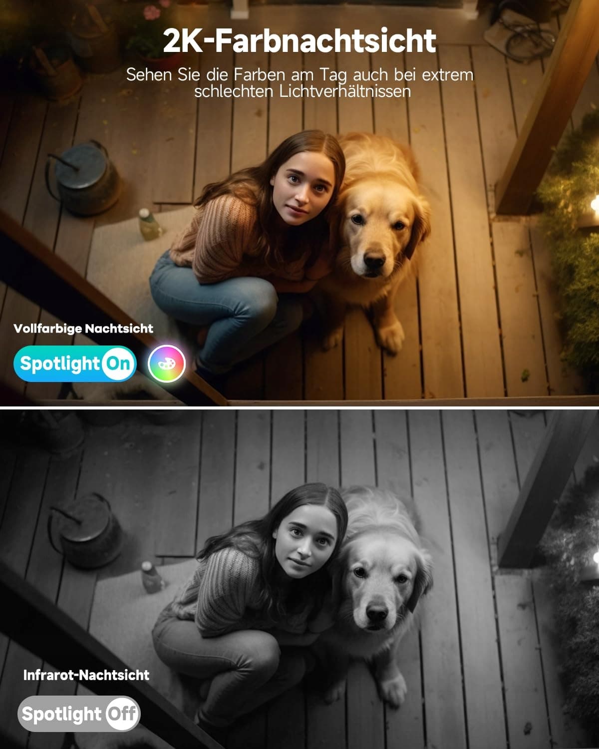 2K 3MP i kolorowy tryb nocny: Rozdzielczość 2K Ultra HD zapewnia wyraźniejszą jakość obrazu i płynniejszą transmisję na żywo. Akumulator kamery zewnętrznej ma wbudowaną diodę LED na podczerwień oraz zewnętrzne białe światło. Posiada 2 tryby nocne: tryb podczerwieni oraz kolorowy tryb nocny. Zasięg widzenia w nocy można rozszerzyć do 10 metrów, dzięki czemu masz pełną ochronę dzień i noc oraz możesz uchwycić każdy ważny moment starszych osób, dzieci lub zwierząt domowych w Twoim domu.