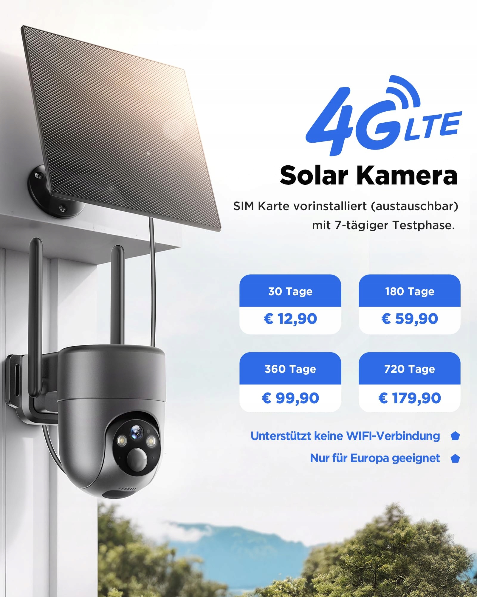 【Niezależność od Wi-Fi】: Nasza 4G solarna kamera monitoringu z kartą SIM korzysta z niezawodnych sieci 4G do szybkiego i stabilnego przesyłania danych – idealne rozwiązanie na miejsca bez dostępu do Wi-Fi, takie jak gospodarstwa rolne, ogrody, stajnie czy place budowy. W kamerze 4G jest już zainstalowana karta SIM z 7-dniowym nieograniczonym pakietem testowym. Można ją używać od razu po rozpakowaniu i natychmiast rozpocząć monitoring! Uwaga: Do stałego użytkowania po okresie testowym wymagany jest abonament danych, a ta kamera solarna z kartą SIM nie obsługuje połączenia Wi-Fi