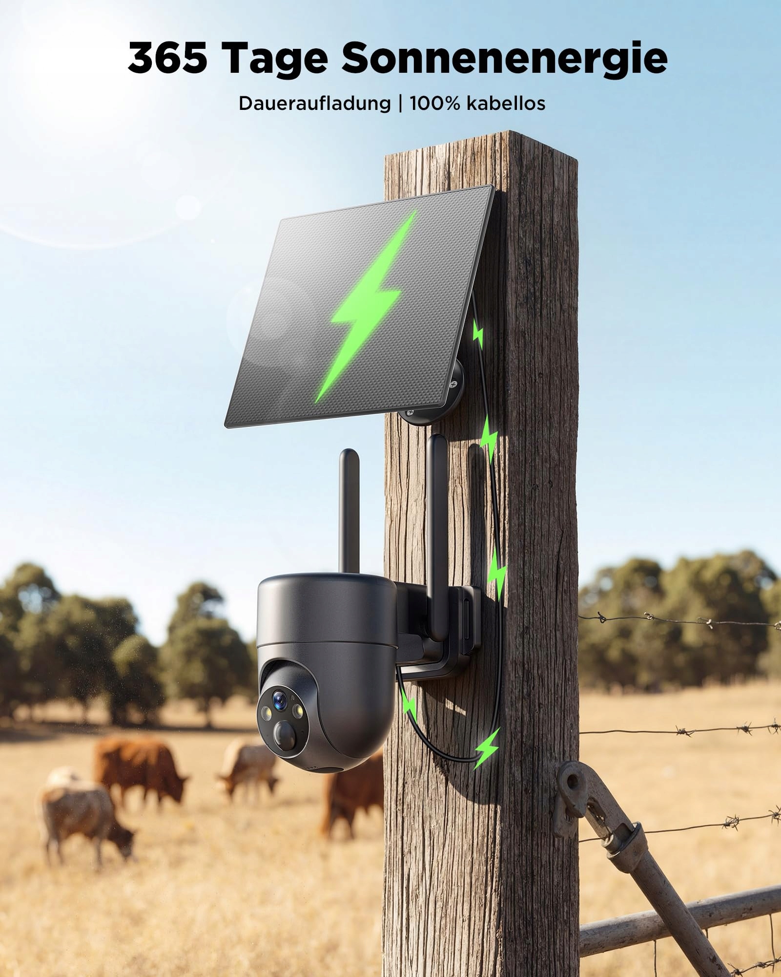 【Zasilanie solarne】: Dzięki panelowi słonecznemu ta 4G LTE kamera monitoringu zewnętrznego działa nieprzerwanie i niezależnie od źródeł zasilania – nawet podczas deszczu czy śniegu! Dołączony 3-metrowy kabel do panelu słonecznego umożliwia elastyczny montaż w słonecznych miejscach o długim nasłonecznieniu, co zapewnia stabilne i nieprzerwane zasilanie kamery zewnętrznej z kartą SIM