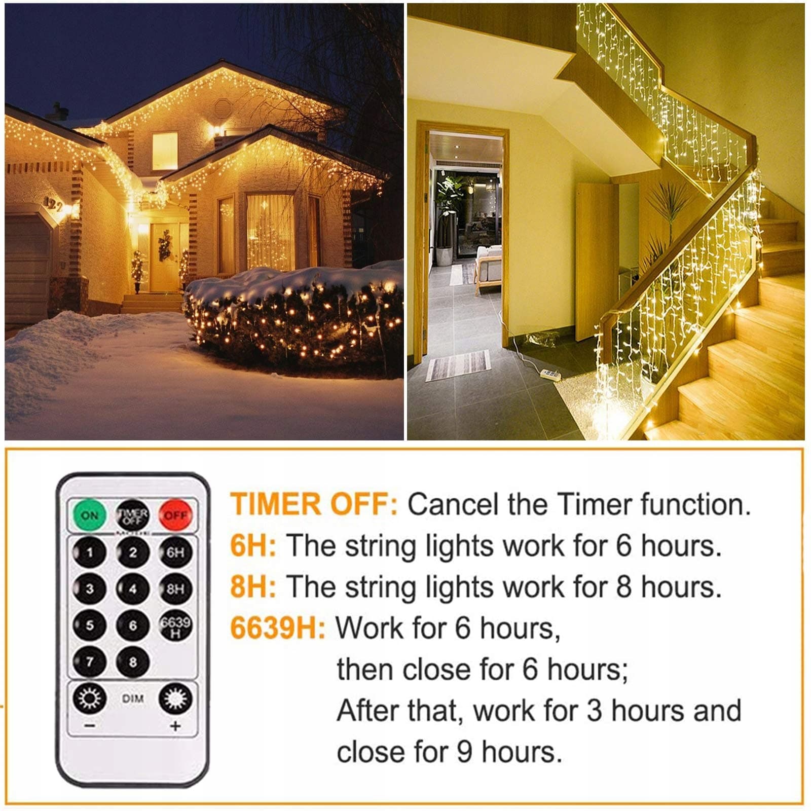 Wodoodporność IP44: Idealny do użytku na zewnątrz bez uszkodzeń, w tym podczas silnego deszczu i śniegu. Należy jednak pamiętać, że wtyczka nie jest wodoodporna. Należy zapewnić jej ochronę lub trzymać z dala od wody. Szerokie zastosowanie: choinki, imprezy, wesela, dom, okna, łazienka, festiwale, święta, pokazy, restauracje, hotele, budynki handlowe, centra handlowe, witryny, puby, kluby, koncerty, sale, kabarety, pokazy mody, tańce, sceny itd.