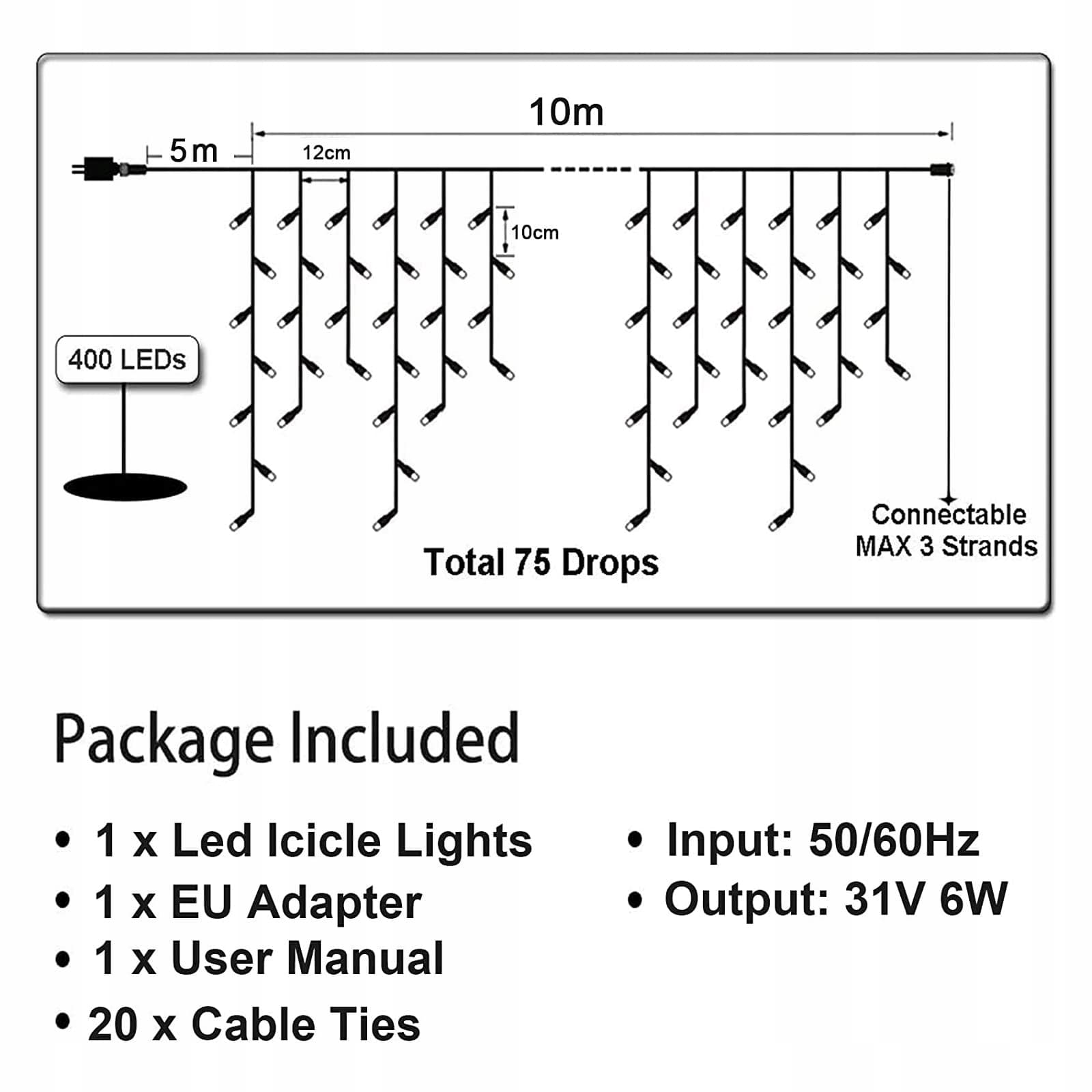 Możliwość łączenia: Ten 10-metrowy łańcuch świetlny z 400 diodami LED, 5 m przewodem zasilającym, a każda lampa z efektem deszczu lodowego posiada połączenie typu end-to-end, które pozwala połączyć do 3 łańcuchów świetlnych, aby uzyskać większy zasięg.