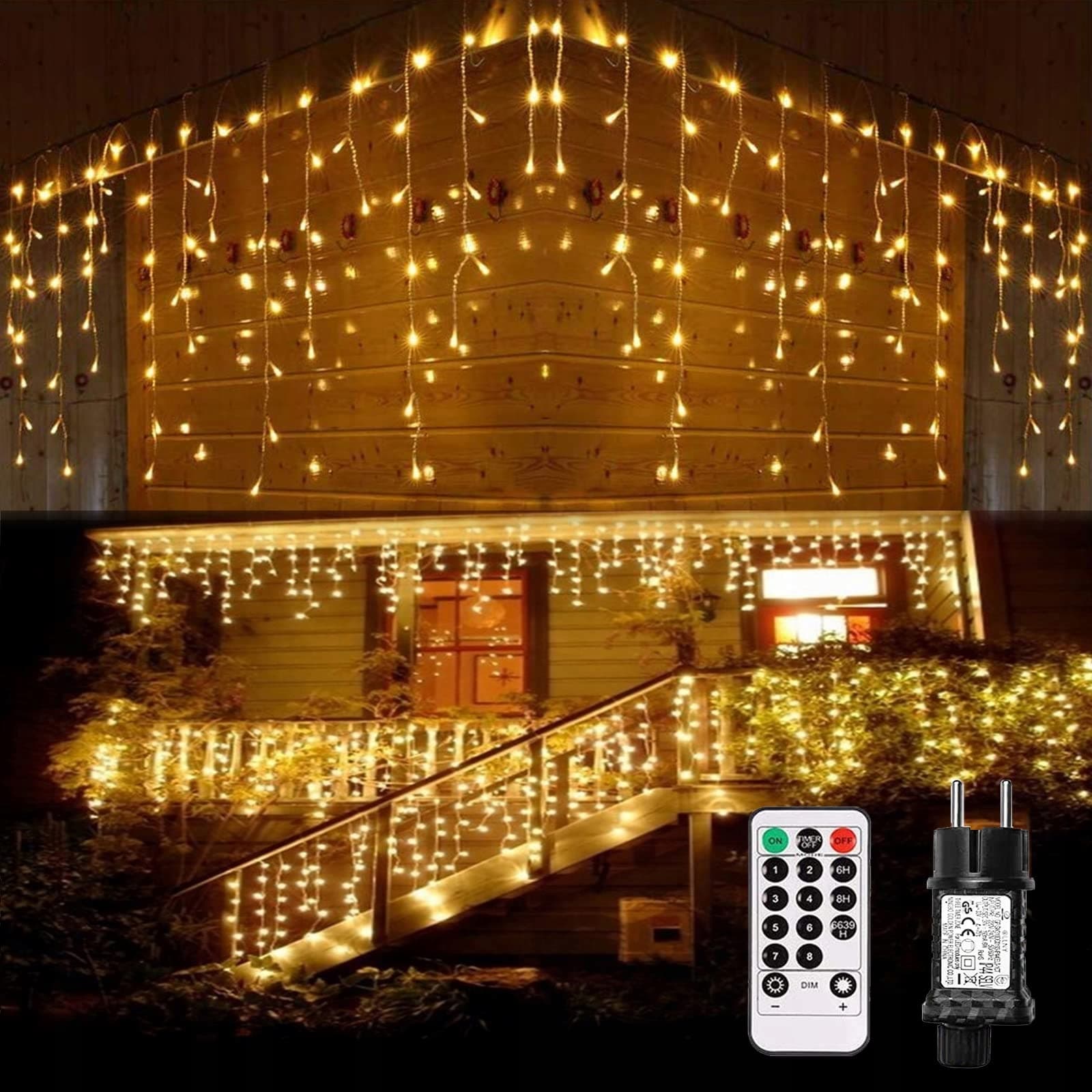 Bezpieczne i energooszczędne: 10m łańcuch świetlny z efektem deszczu lodowego z certyfikatem GS, zasilacz z certyfikatem SGS GS, napięcie wejściowe: 100V-240V ~ 50/60 Hz, napięcie wyjściowe: 31V = 193 mA 6 W, zapewniające wystarczające światło bez oślepiania