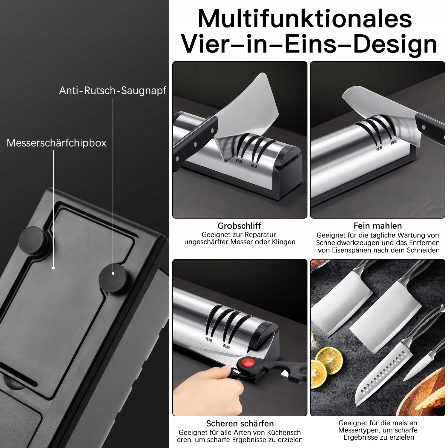 🥩【Dwa stopnie szlifowania】 Nasza elektryczna ostrzałka noży ma dwa stopnie szlifowania, jednopoziomowe szlifowanie wstępne, dwupoziomowe szlifowanie i polerowanie, do ostrzenia noży kuchennych i wielofunkcyjnych. Spód elektrycznej ostrzałki noży ma antypoślizgową podstawę oraz pojemnik na pył szlifierski.