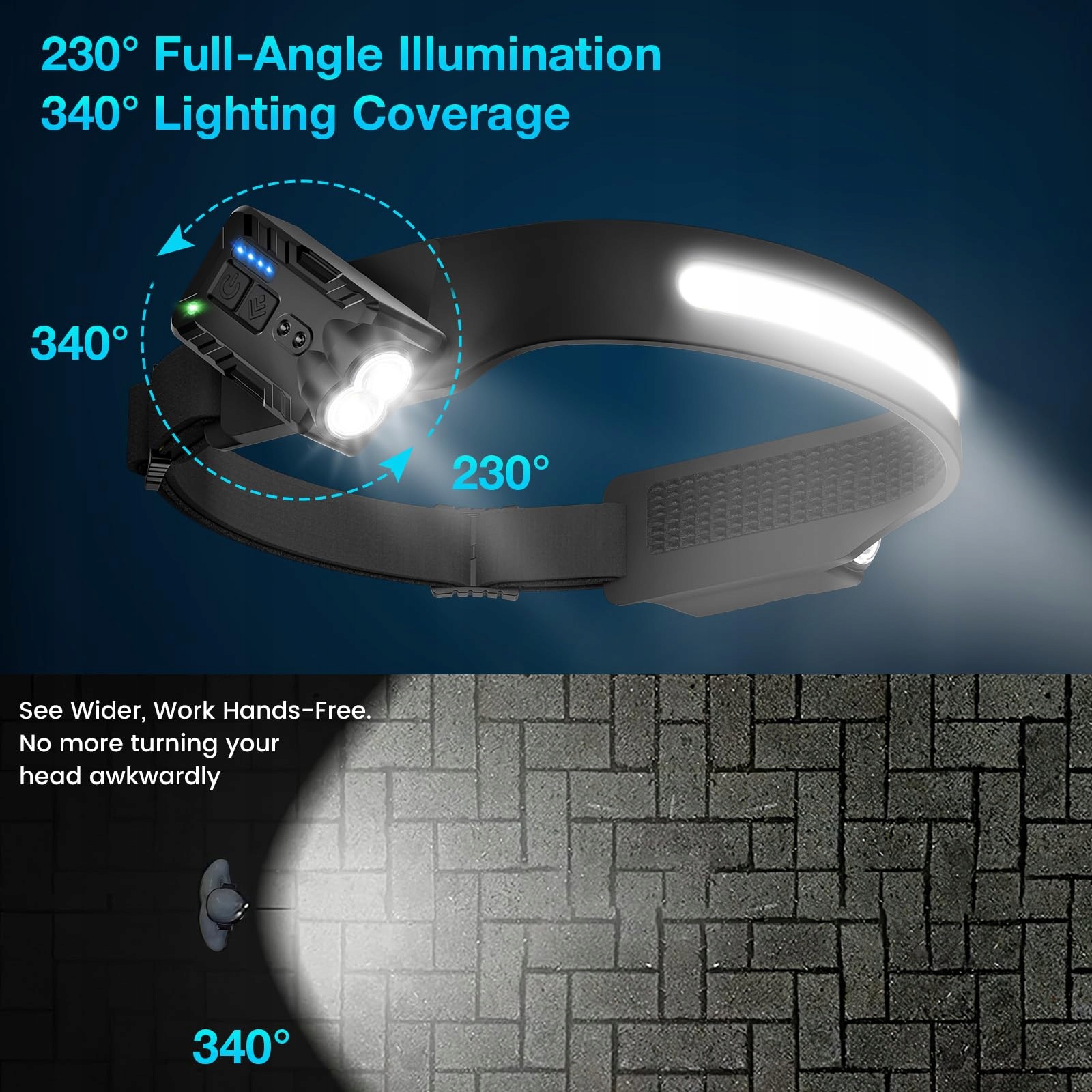 Latarka czołowa LED wielokrotnego ładowania z oświetleniem 360°: wyposażona w 4 główne światła + 2 obrotowe światła boczne (obracane o 270°). Zmienny kąt oświetlenia (230° szeroko, do 340° pełne pokrycie) umożliwia elastyczne oświetlenie bez ruchu głowy. Idealna do biwakowania, wędkowania, nocnych wędrówek i sytuacji awaryjnych