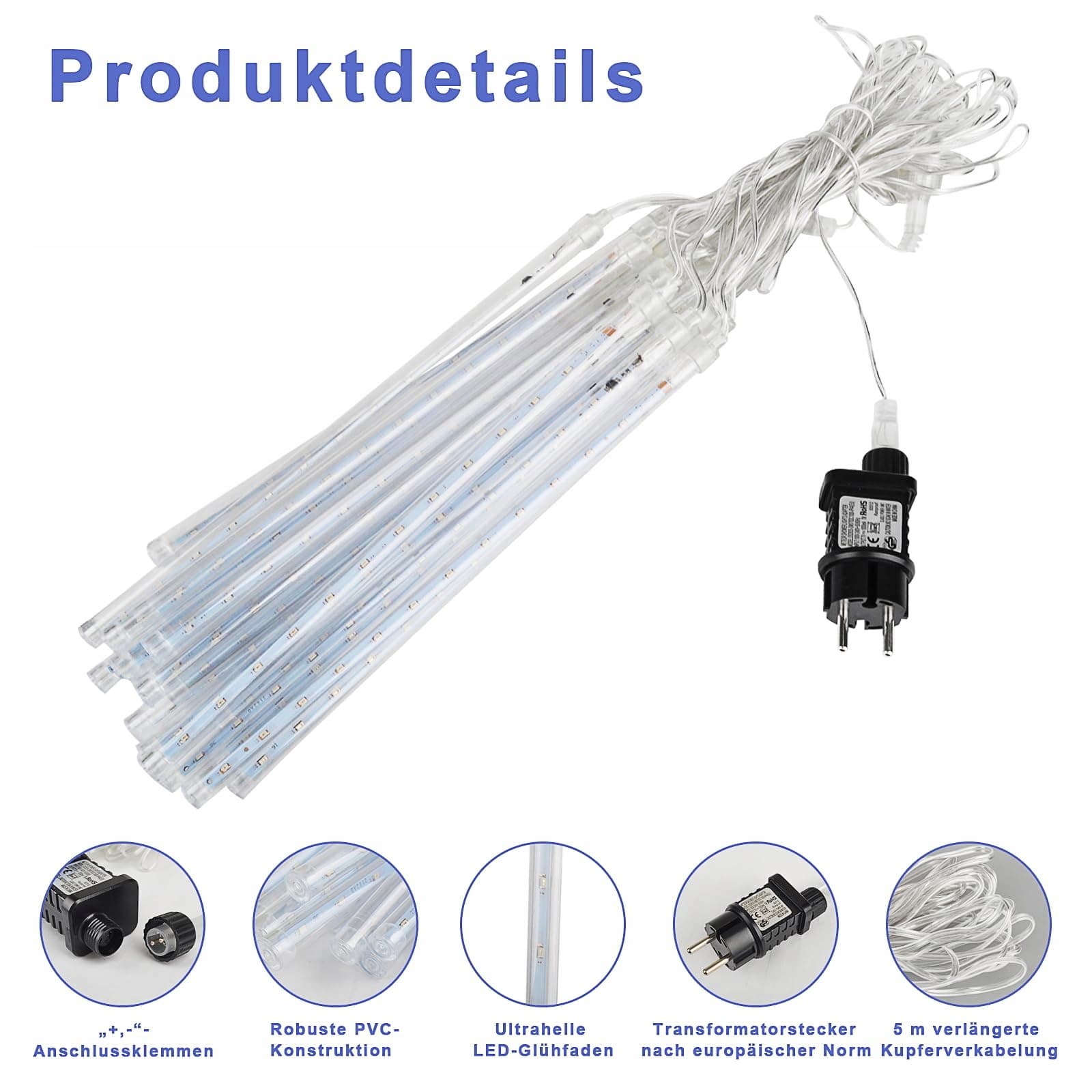 Specyfikacje meteorowego deszczu: Całkowita długość łańcucha lamp to około 12,6 m, długość lampy 30 cm, każda rura lampy ma 24 diody LED (rozłożone po obu stronach), zestaw zawiera 20 rur, odstęp między lampami 40 cm. Zasilanie niskonapięciowe 7 V, mniej niż bezpieczne napięcie dla człowieka, aby zapobiec ryzyku porażenia prądem i pożaru.