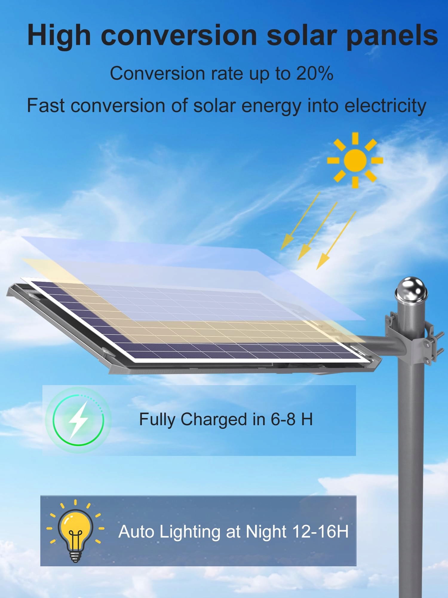 【Super jasne lampy solarne】Solarne latarnie uliczne wyposażone są w 240 ultra jasnych diod LED o temperaturze barwowej 6500K oraz soczewkę wypukłą, która skupia światło i zwiększa zasięg promieniowania (obszar 3800 stóp kwadratowych), umożliwiając oświetlenie o szerokim kącie 260 stopni.