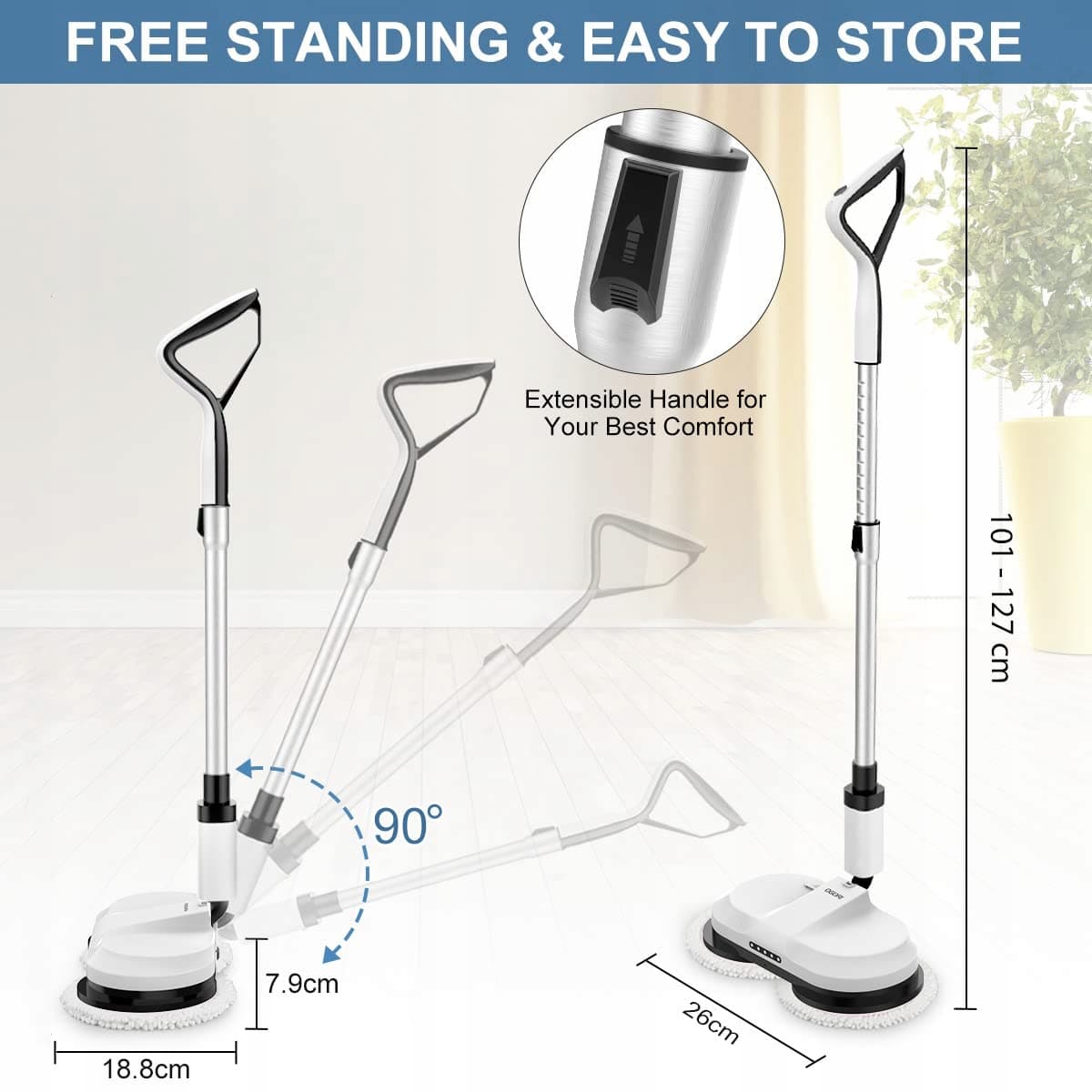🌺 REGULOWANA WYSOKOŚĆ, OŚWIETLENIE LED - Dzięki reflektorowi LED, plamy można łatwiej dostrzec przy dokładniejszym spojrzeniu pod narożnikami mebli. Wysokość elektrycznego mopa można regulować od 101 cm do 127 cm, dzięki czemu każdy może wygodnie używać elektrycznego mopa. ROZMIAR: 26 cm x 18,8 cm x (101~127) cm.