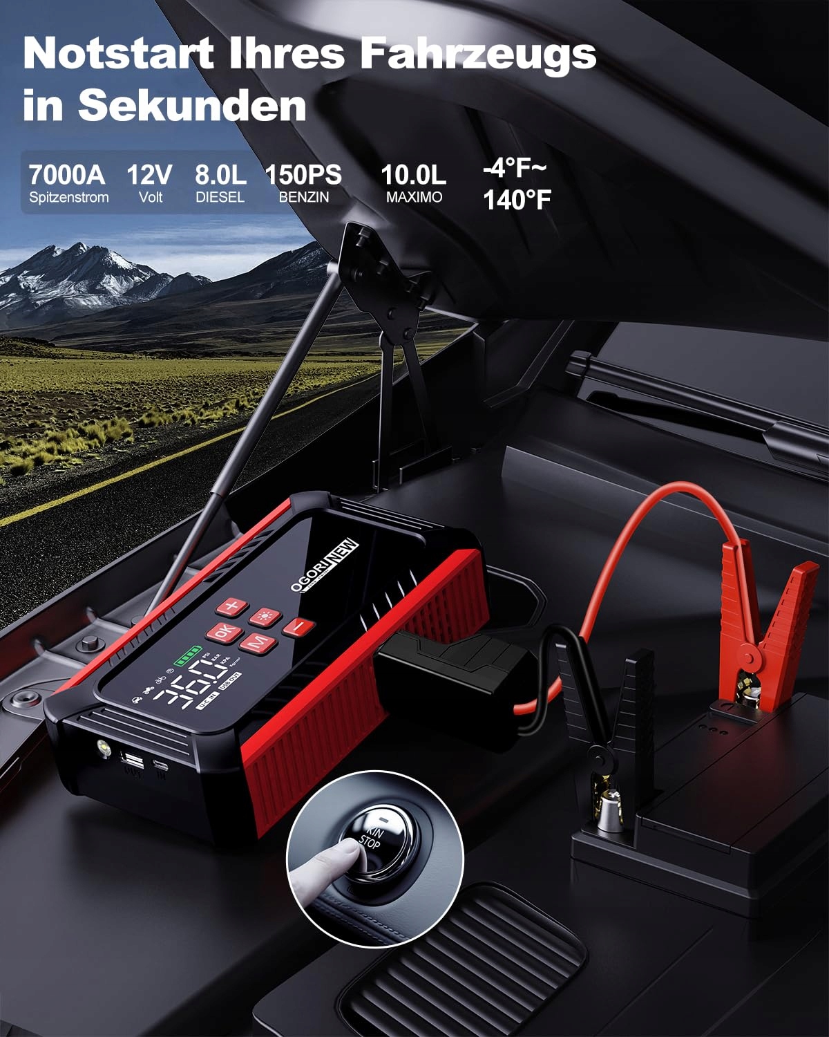 🚗 Mocna funkcja rozruchu: z prądem szczytowym do 7 000A, ulepszonymi inteligentnymi zaciskami i wyświetlaczem LCD, urządzenie zapewnia natychmiastowy i bezpieczny rozruch pojazdów 12V. Kompatybilne z samochodami osobowymi, SUV-ami, motocyklami i ciężarówkami. Zaprojektowane do łatwego uruchamiania silników benzynowych do 10,0L oraz diesla do 8,0L – nawet w ekstremalnych temperaturach od -20 °C do 60 °C.