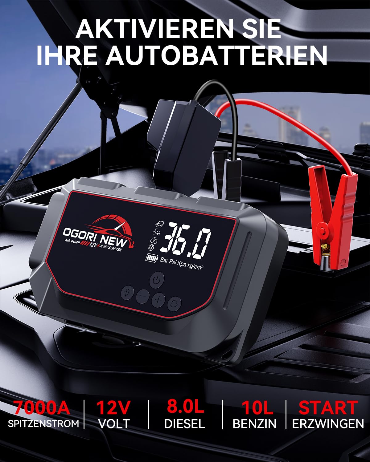 Powerbank rozruchowa do samochodu z kompresorem 150 PSI, powerbank rozruchowy 7000A do 12 V (8L benzyna/10L diesel), OGORI NEW Booster rozruch samochodowy z latarką LED + kabel USB do ładowania