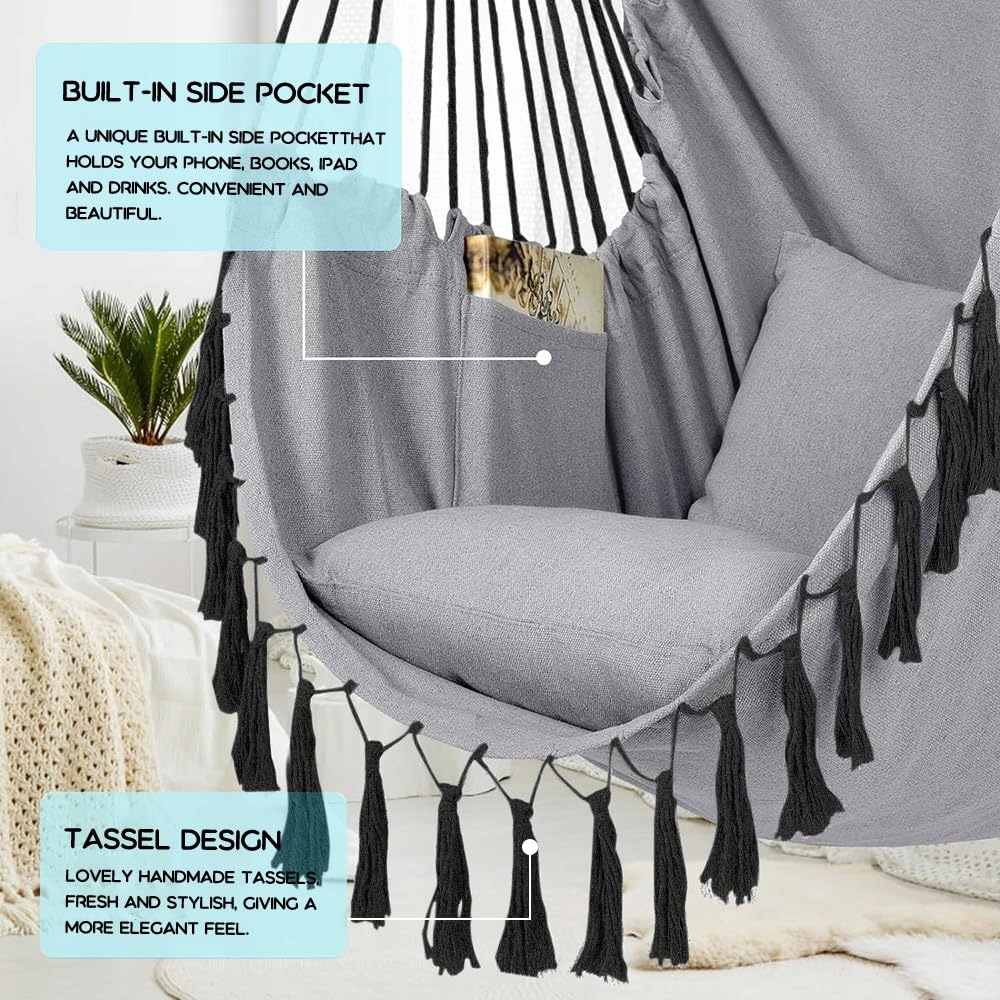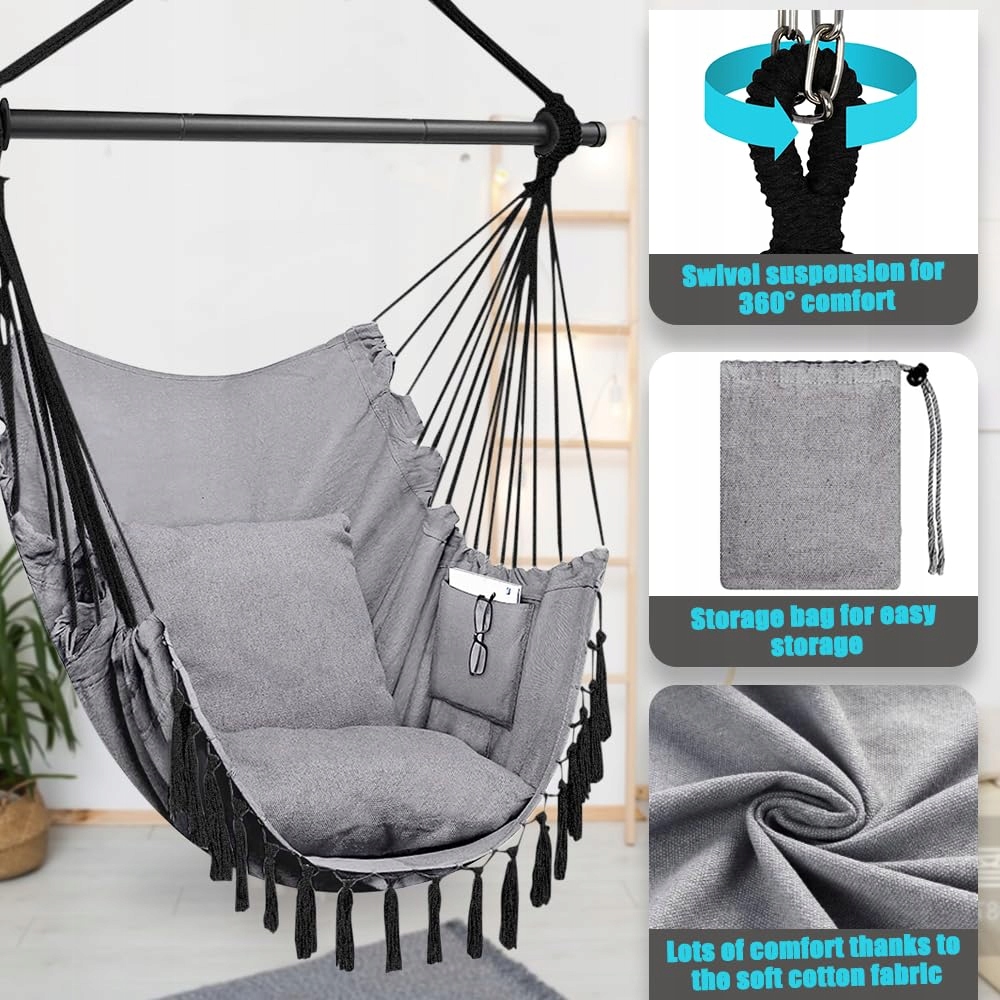 HÄNGESSESSEL Fotel Wiszący z 2 Poduszkami i Torbą dla Dzieci i Dorosłych do Wnętrz i Ogrodu Maksymalne Obciążenie 150 kg Jasnoszary