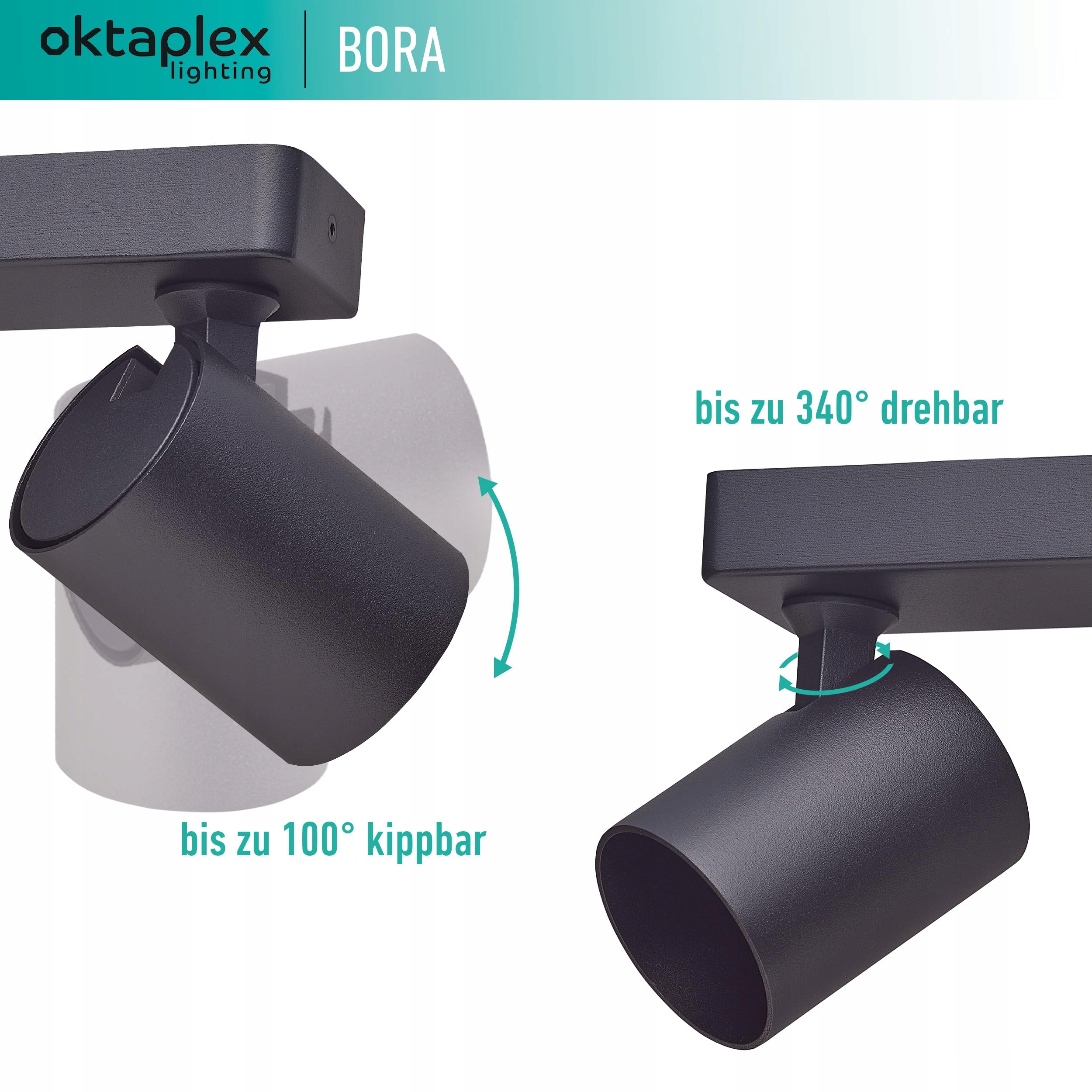Regulowany: Głowica lampy obraca się o 340° i jest obrotowa o 100°.