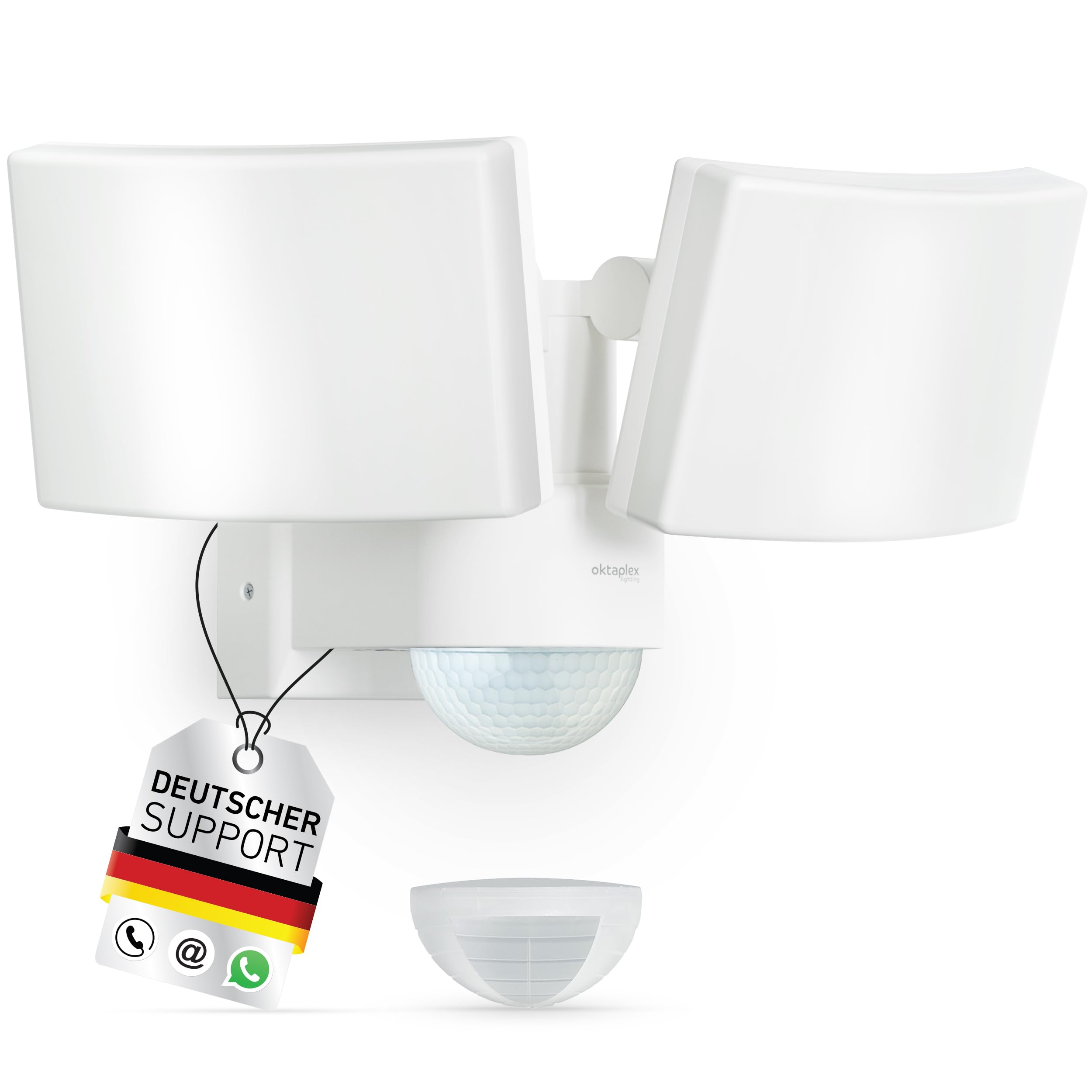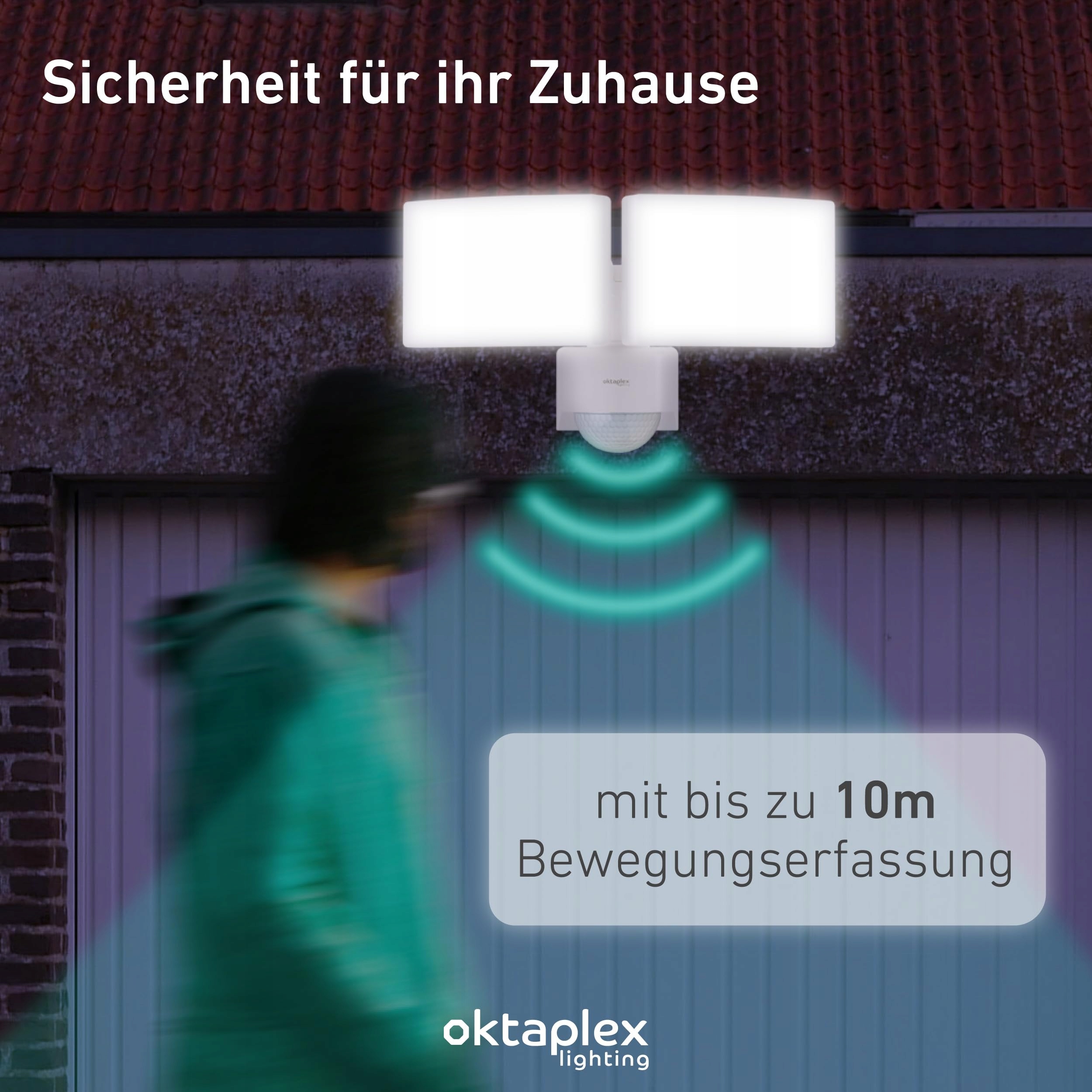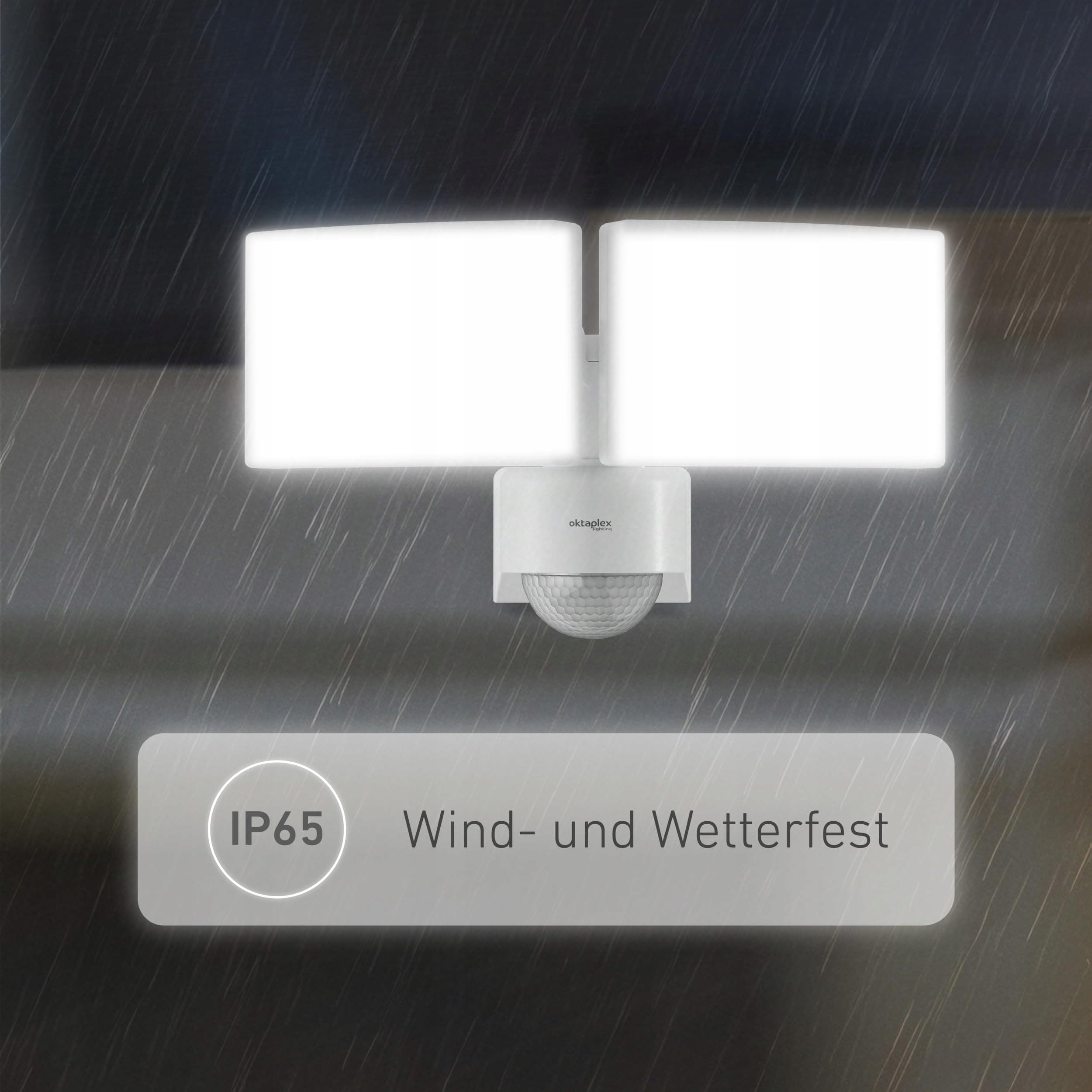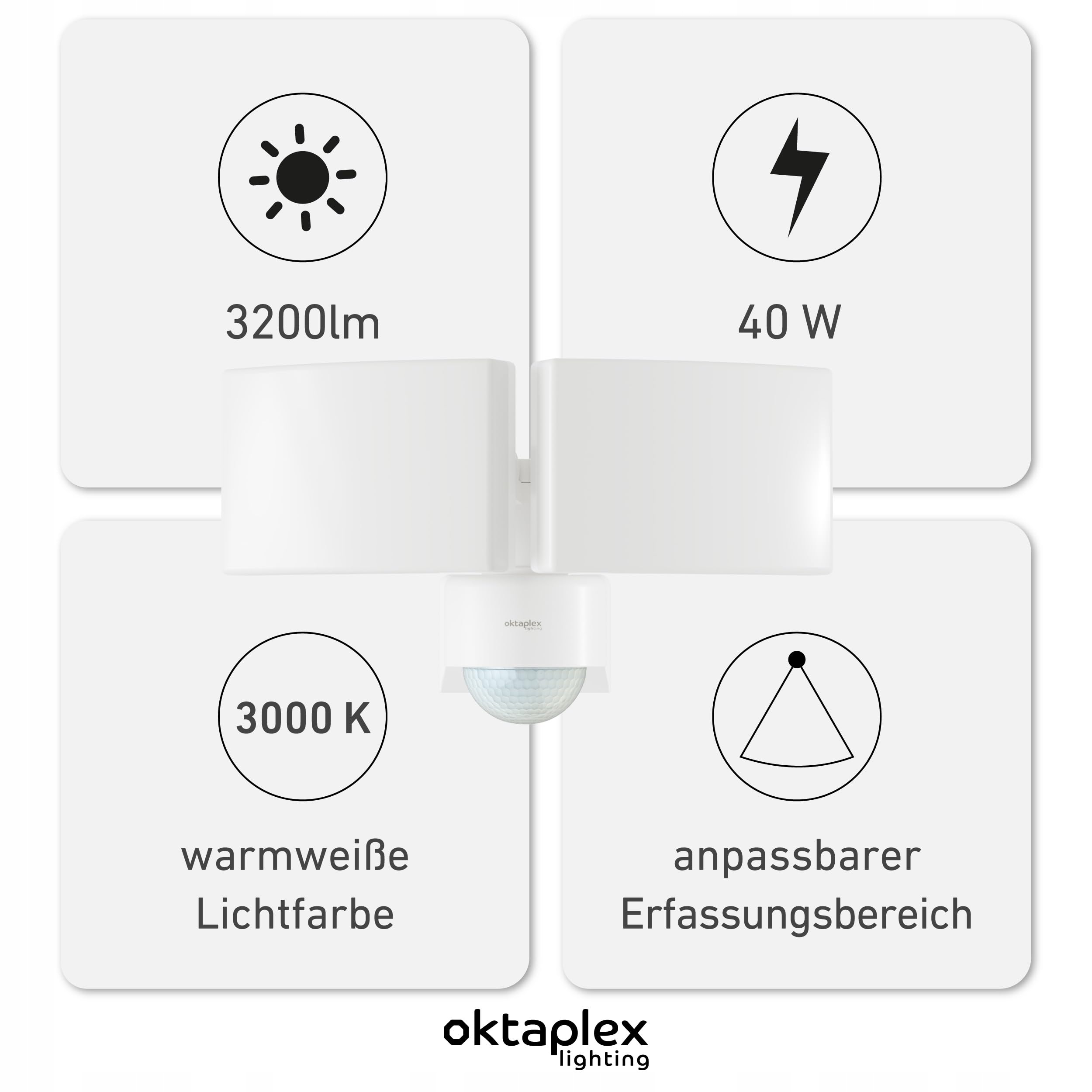 Oktaplex Cali Dos LED Reflektor z czujnikiem ruchu na zewnątrz 3000K ciepła biel 40W IP65 Lampa zewnętrzna biała kinkiet z wyjściem przełączanym