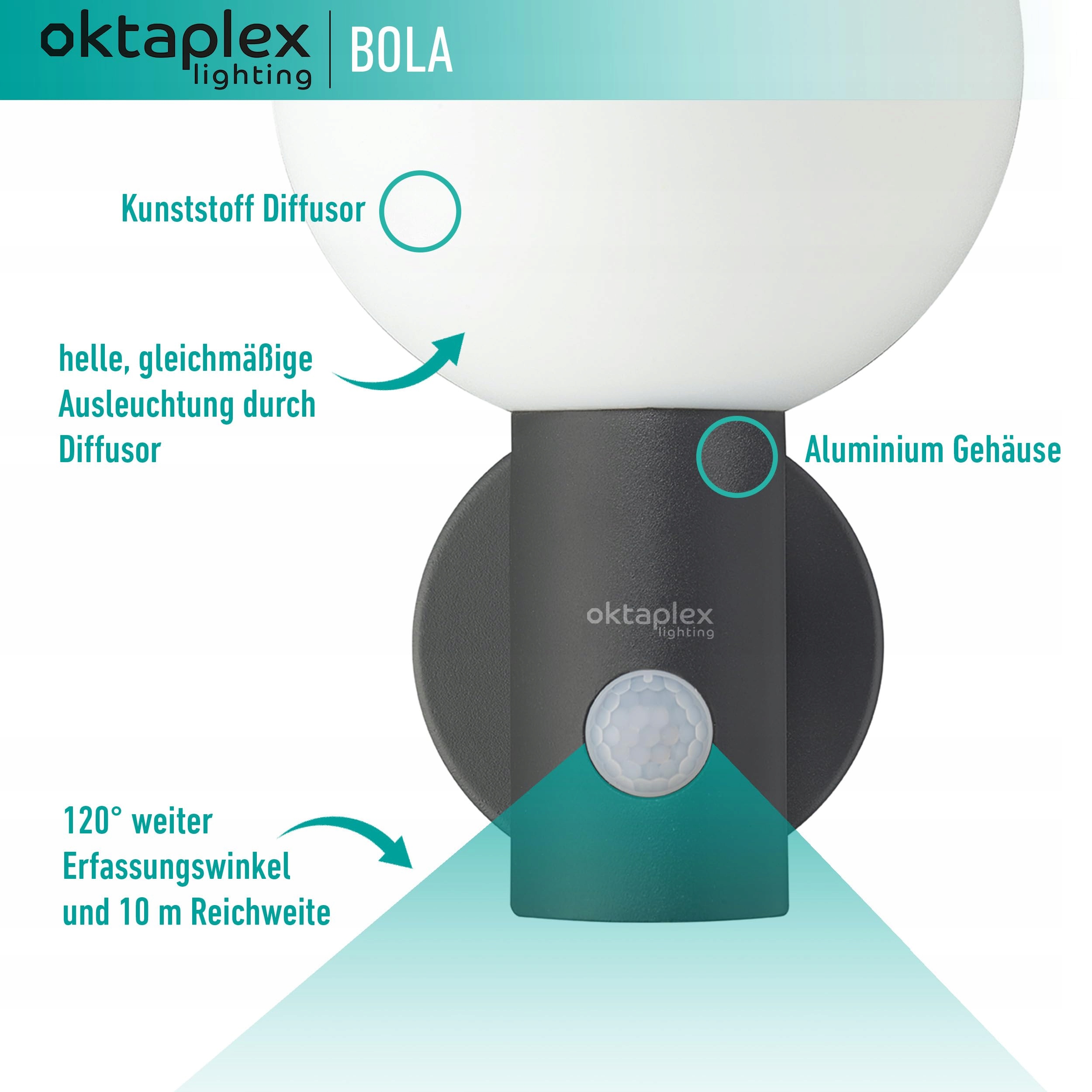 Oktaplex Bola LED lampa zewnętrzna z czujnikiem ruchu aluminium IP65 3000K ciepłe białe światło 360° 1600lm 15,7W lampa ścienna zewnętrzna okrągła antracyt
