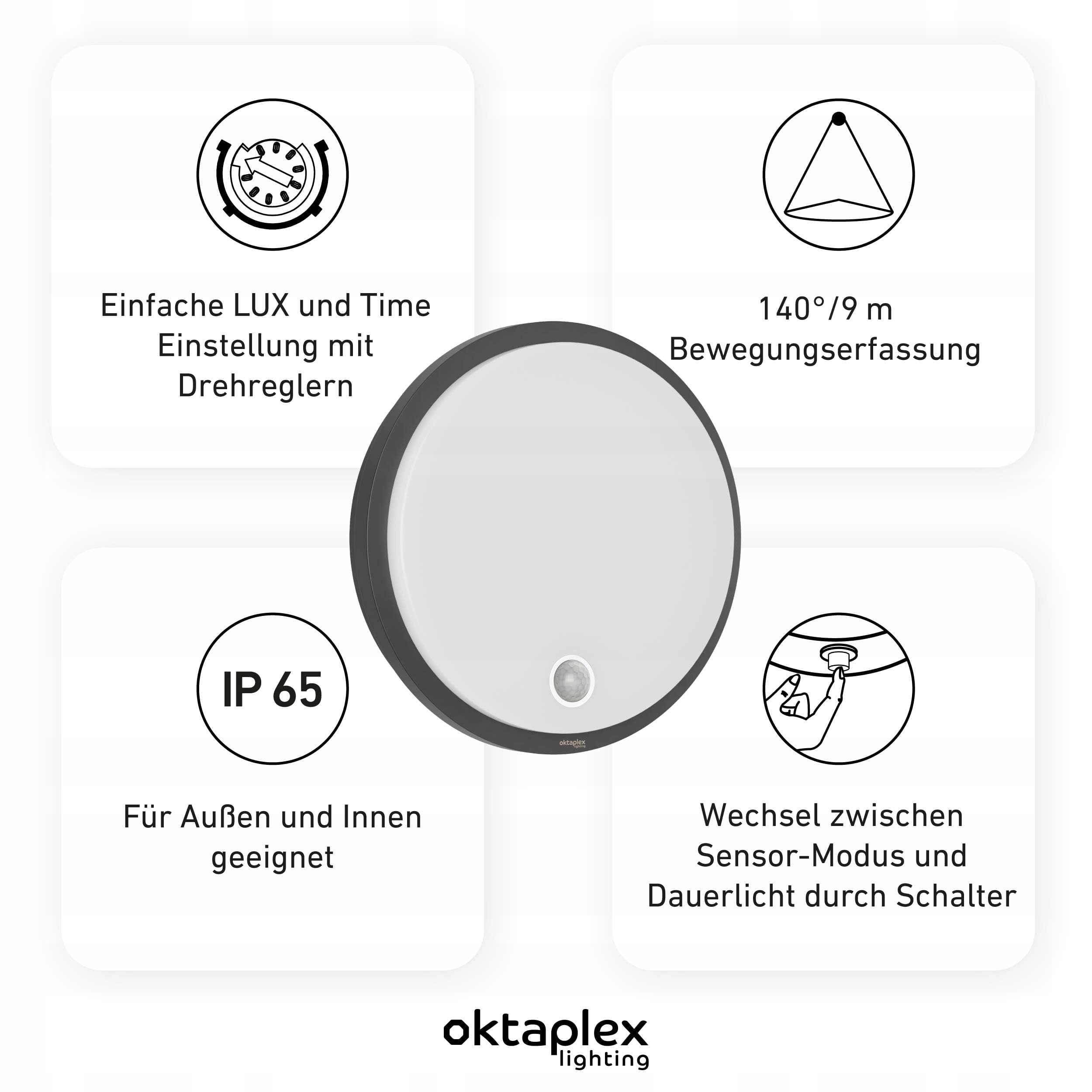 W zestawie: Oktaplex Plato Lampa zewnętrzna z czujnikiem w kolorze antracytowym, ⌀21 x 5,3 cm, wraz z materiałem montażowym.