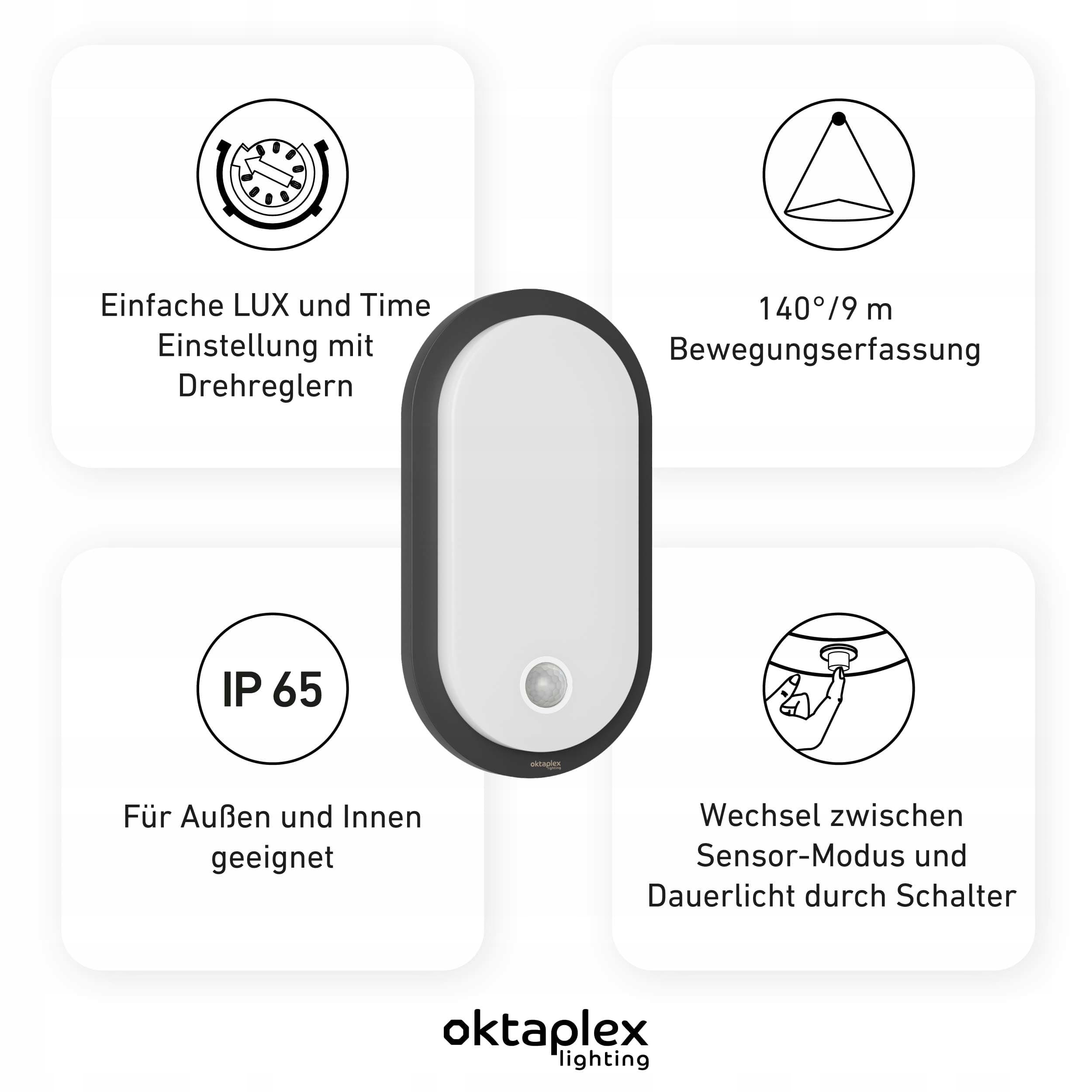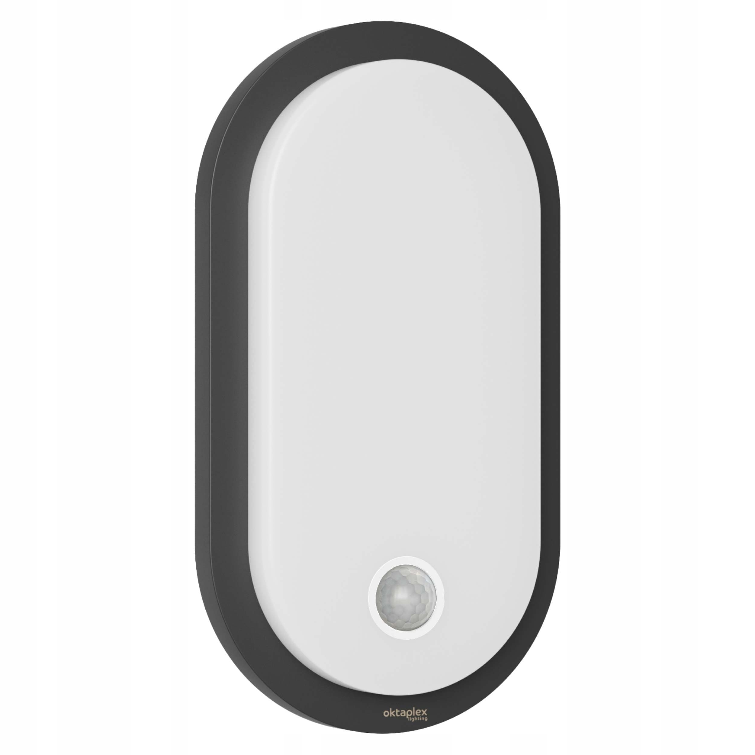 Oktaplex Plato Lampa zewnętrzna z czujnikiem ruchu i przełącznikiem światła stałego 3000K ciepła biel 1010lm IP65 LED Kinkiet owalny antracyt 10,5W 230V