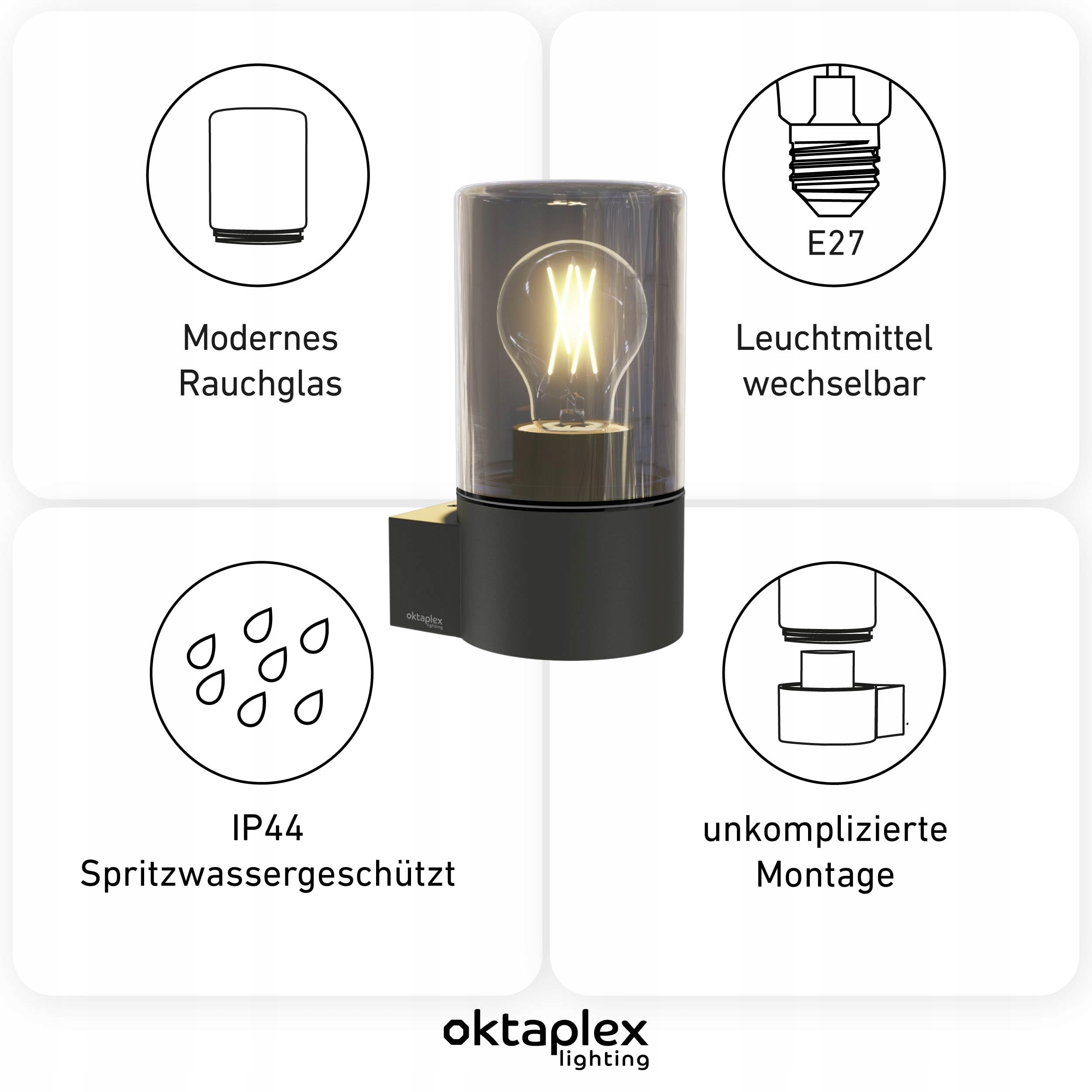 Odpowiedni dla żarówek E27 do 28W (brak w zestawie). Lampa zewnętrzna odporna na zachlapanie IP44.