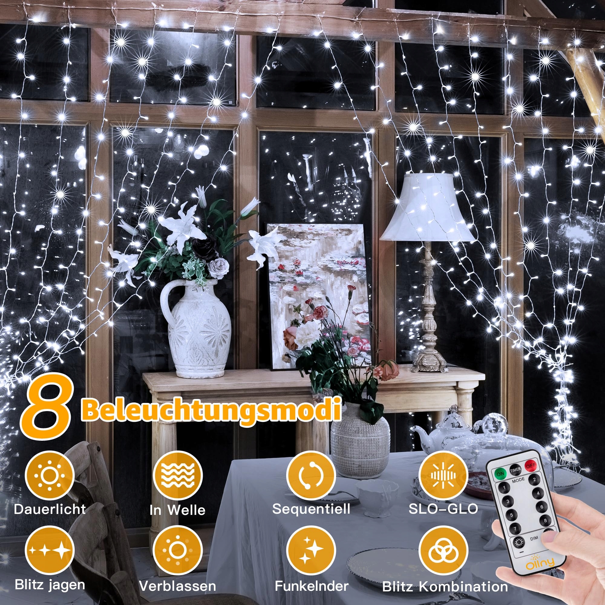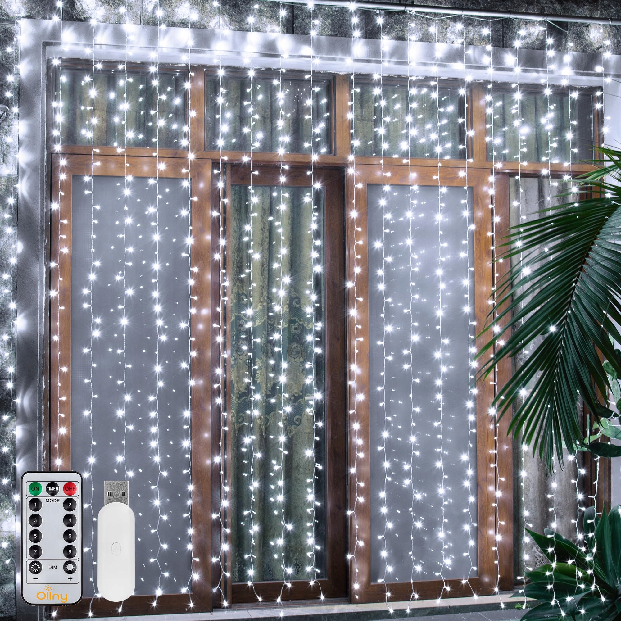 Ollny kurtyna świetlna wewnętrzna zewnętrzna, 3x3m 300 LED łańcuch świetlny zewnętrzny wewnętrzny USB z pilotem i timerem, ściemnialne łańcuchy świetlne kurtyna do okien na Boże Narodzenie sypialnia ściana (biały)