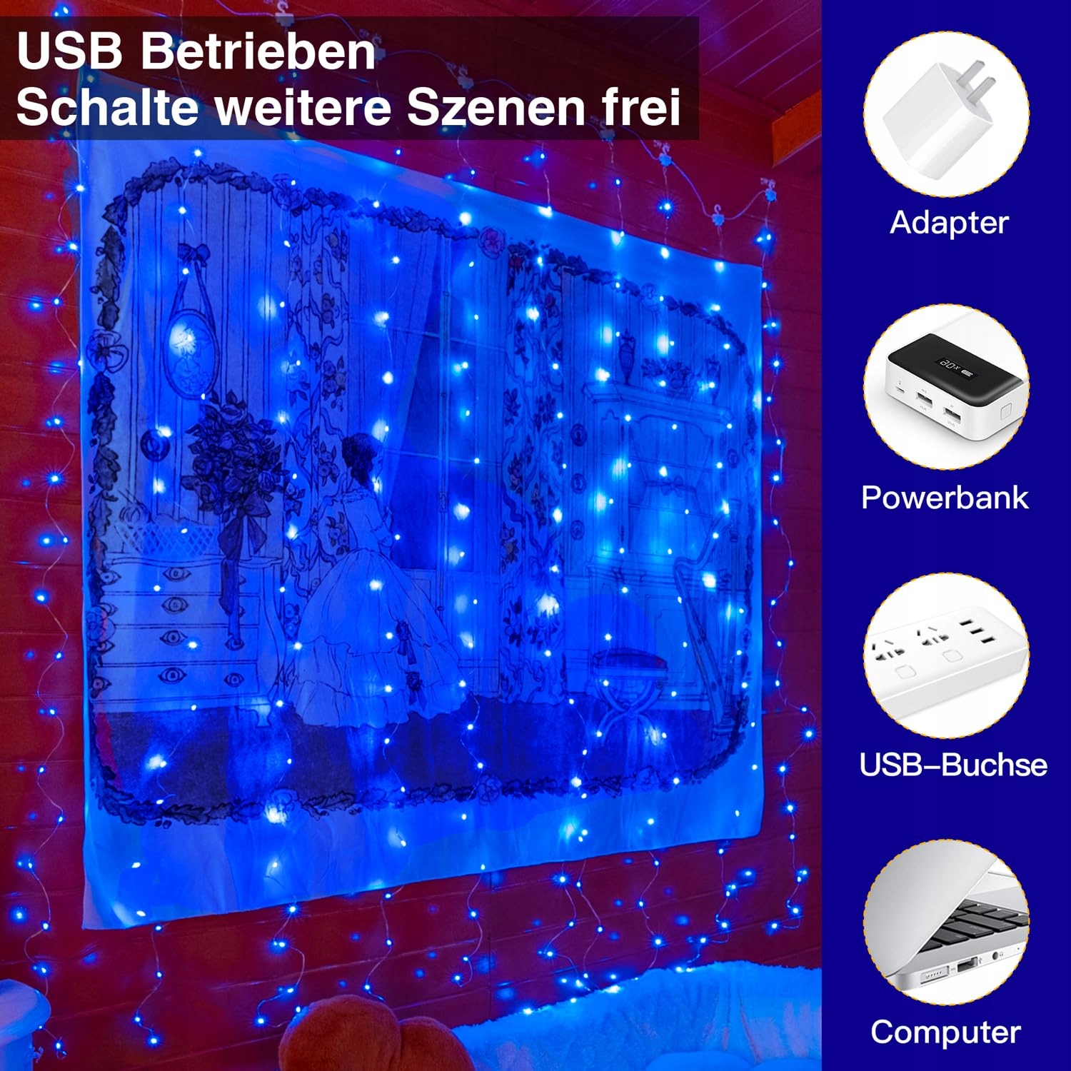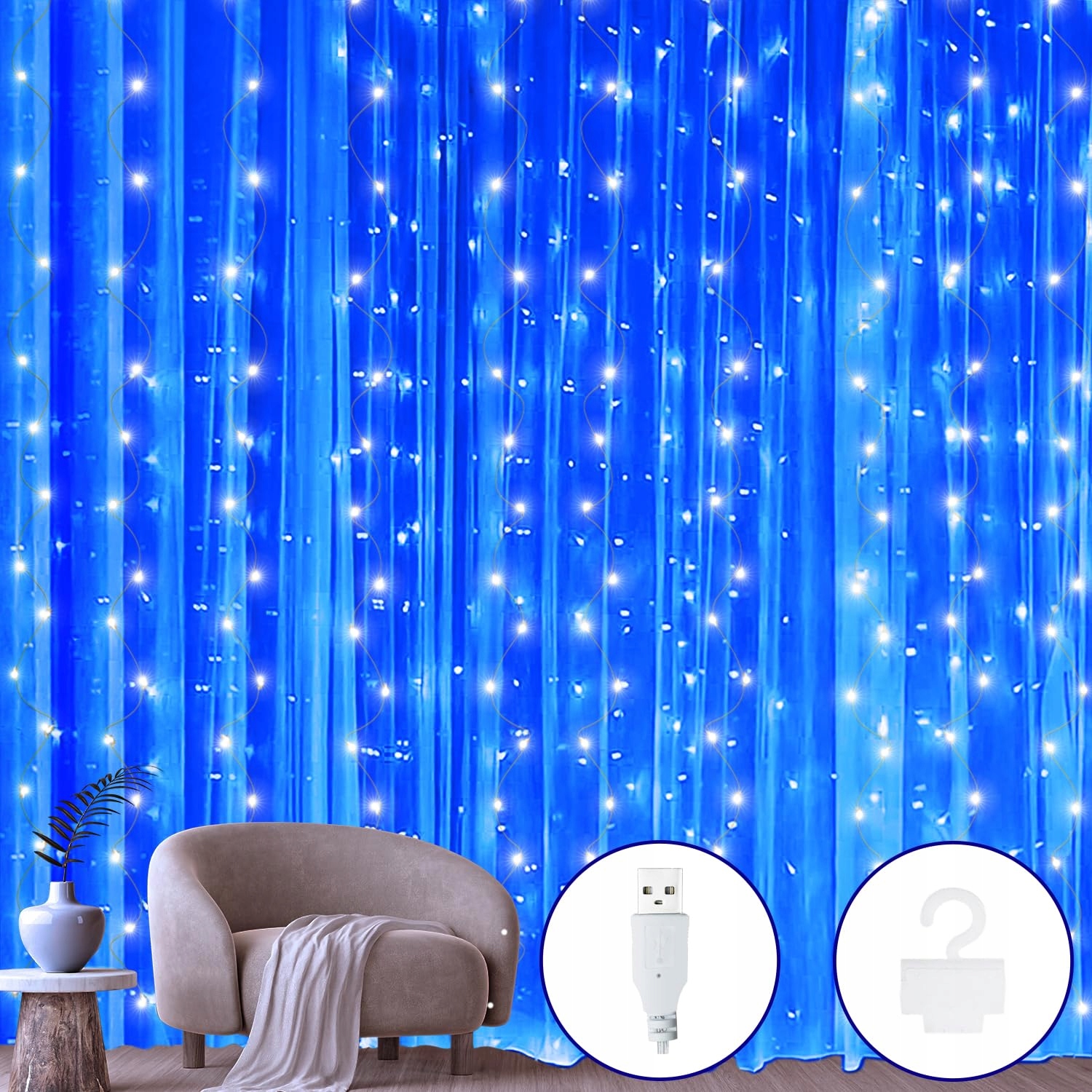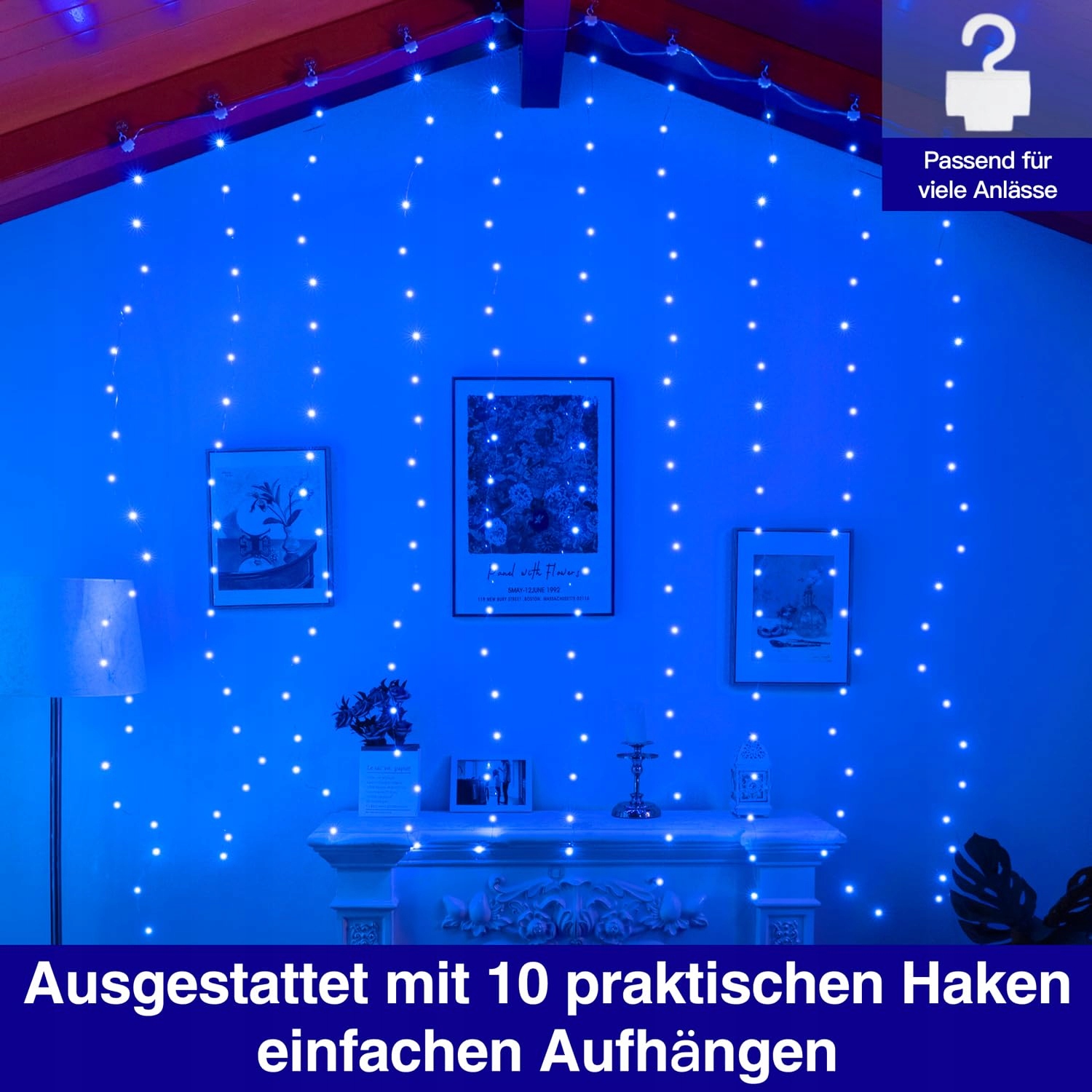 Ollny LED kurtyna świetlna 2x2m, 200 LED kurtyna świetlna wewnętrzna USB, girlanda świetlna wewnętrzna na okno z 10 haczykami, do dekoracji wewnątrz i na zewnątrz, sypialnia, impreza, ściana, balkon (niebieski)