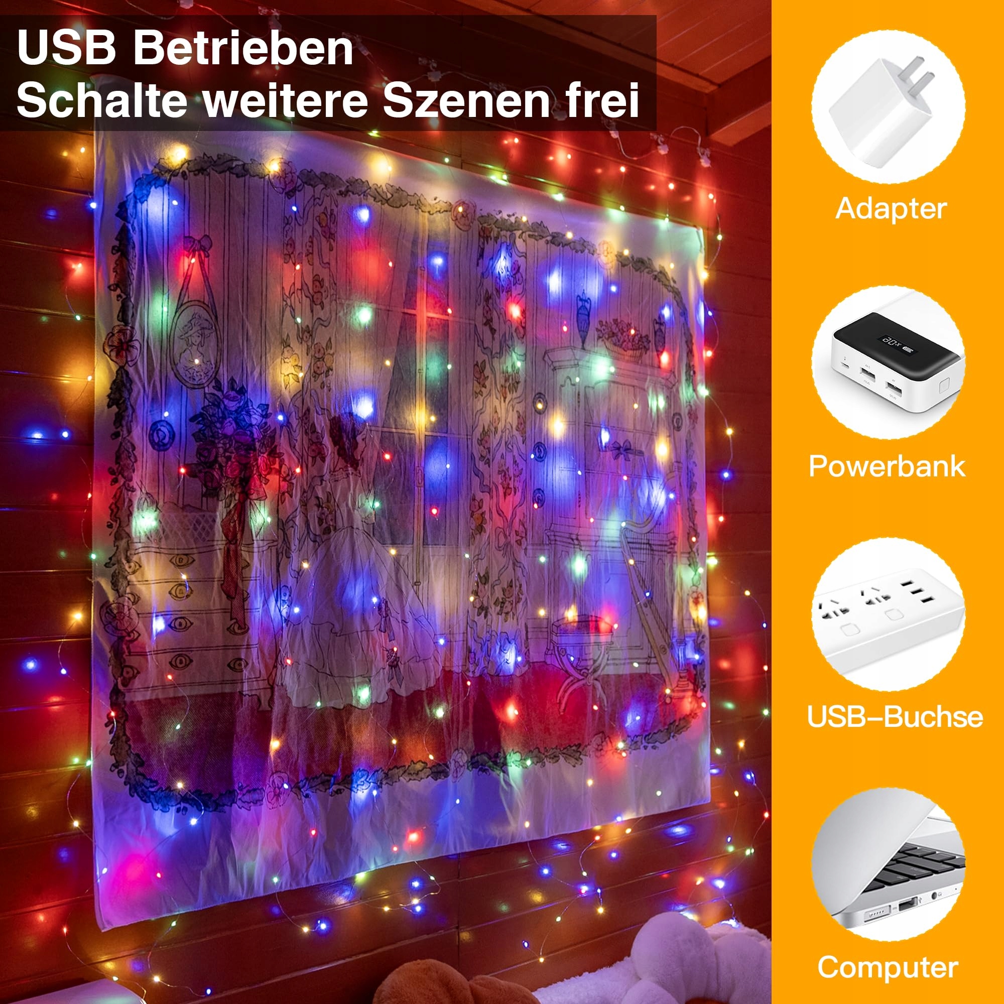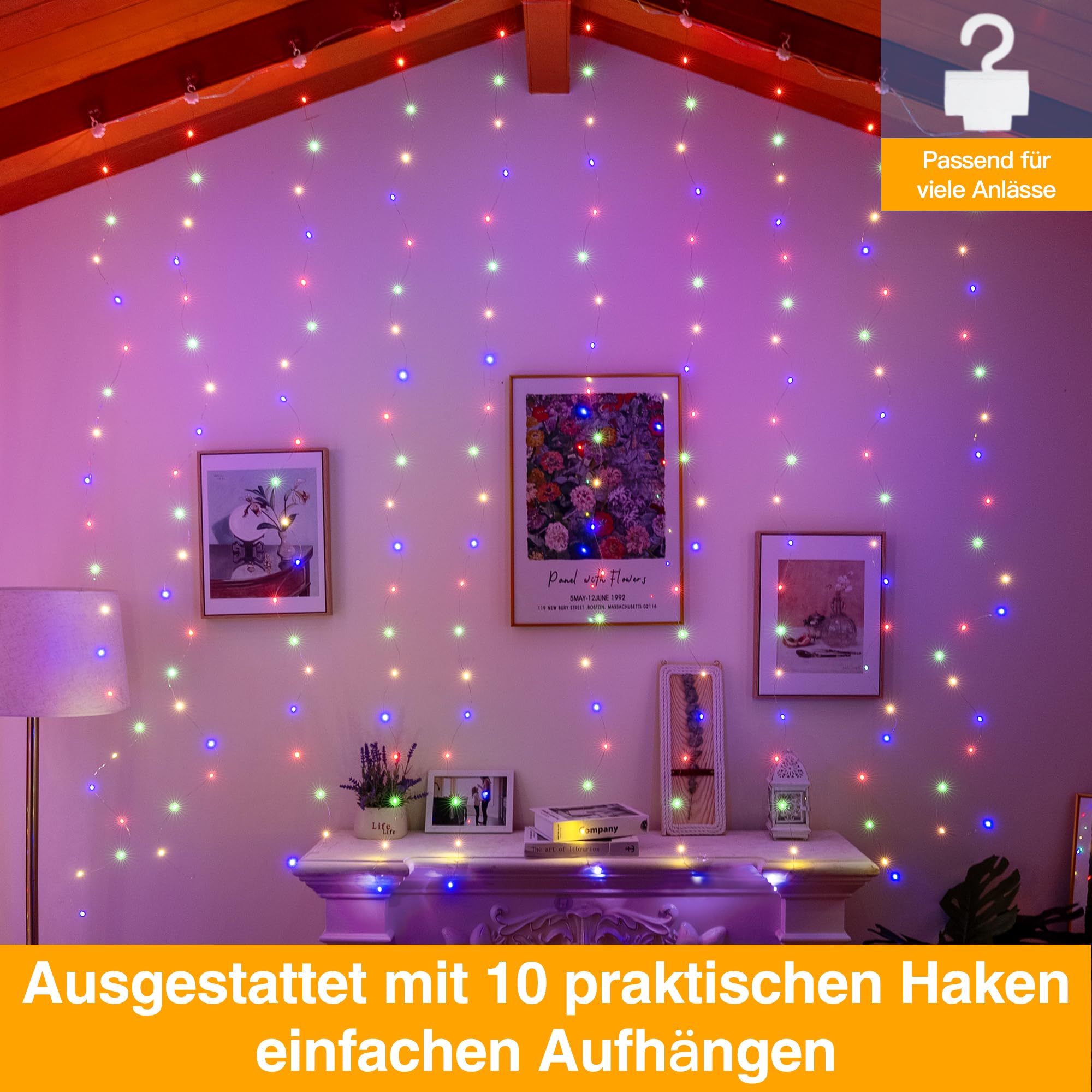 2 x 2 m LED kurtyna świetlna: Dzięki 10 haczykom można je łatwo zawiesić na zasłonie, zasłonie łóżka, ścianie, drzwiach; 200 LED kurtyna świetlna tworzy romantyczną atmosferę, kompletna z 3 m przedłużaczem, który rozszerza możliwości dekoracyjne
