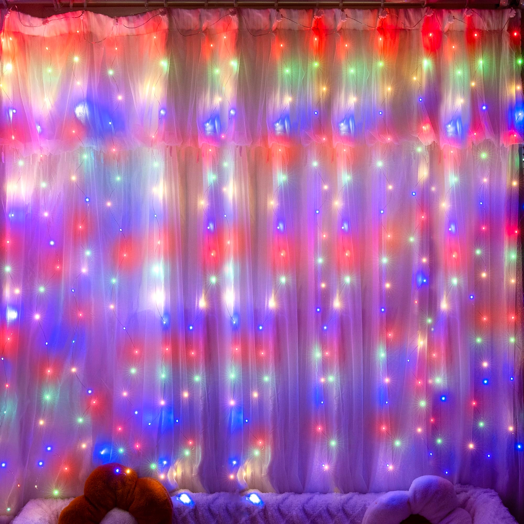 Ollny LED kurtyna świetlna 2x2m, 200 LED kurtyna świetlna wewnętrzna USB, łańcuch świetlny wewnętrzny okienny z 10 haczykami, do dekoracji wewnętrznej i zewnętrznej sypialni, imprezy, ściany, balkonu (kolorowy)