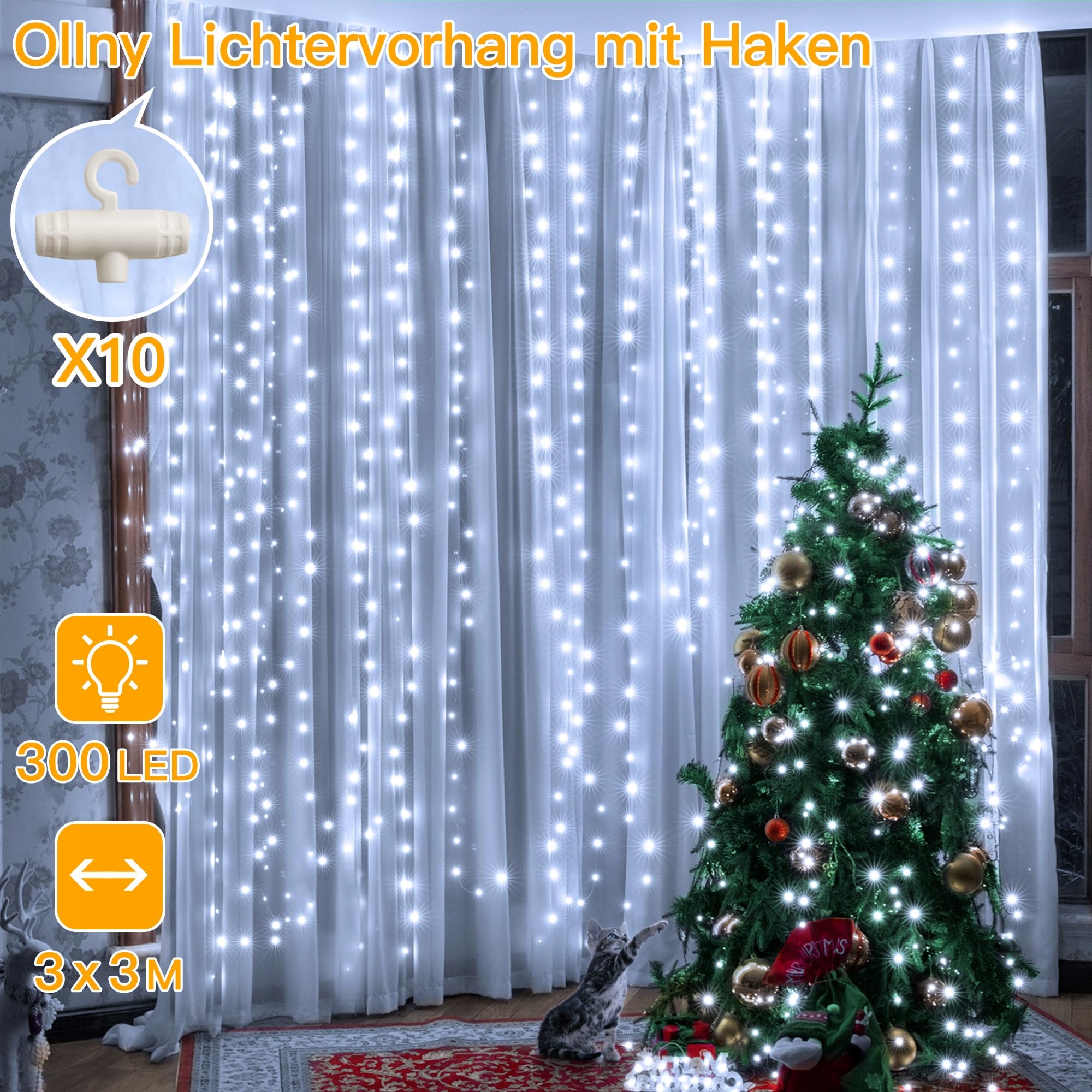 Ollny zasłona świetlna wewnętrzna 3x3m, 300 LED łańcuch świetlny zewnętrzny biały wodoodporny, USB łańcuch świetlny zasłona na Boże Narodzenie okno ściana pokój impreza dekoracja zasłona balkon