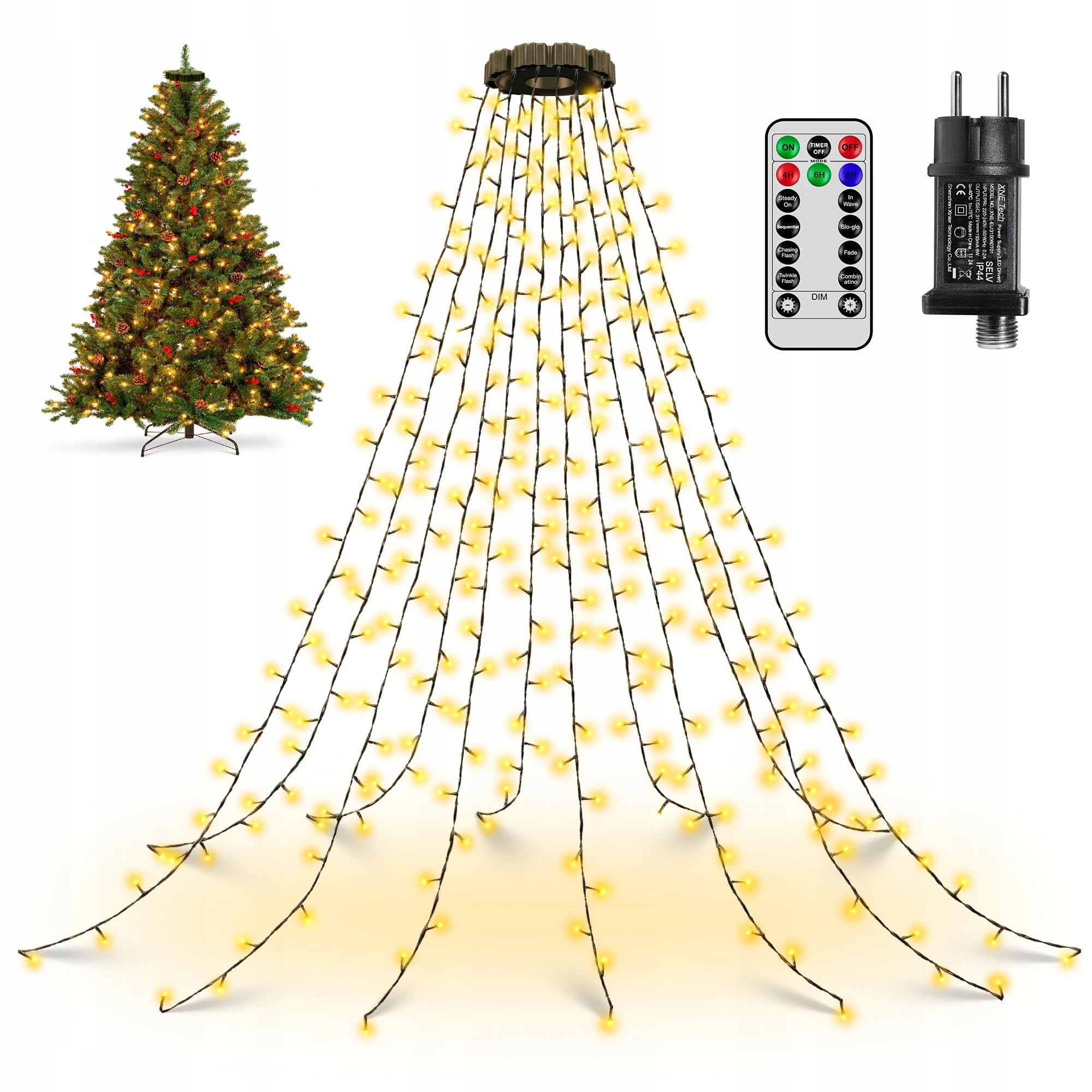 Ollny Lichterkette Weihnachtsbaum 2.5M, 300 LED Lichterkette außen innen 12 Stränge mit Ring Timer, 8 Modi wasserdicht Weihnachtsbeleuchtung außen für 150cm 180cm 240cm Baum(warmweiß)