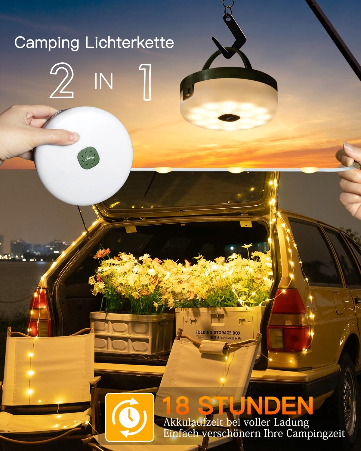 [Wszystko-w-jednym sprzęt kempingowy]: Dzięki Ollny Camping Lichterkette zwijalny otrzymujesz nie tylko wysokiej jakości łańcuch świetlny, ale także praktyczną lampę kempingową. 10-metrowy łańcuch świetlny w ciepłej bieli tworzy przytulną atmosferę pod gwiazdami lub przy ognisku, idealny dla par i kempingowiczów