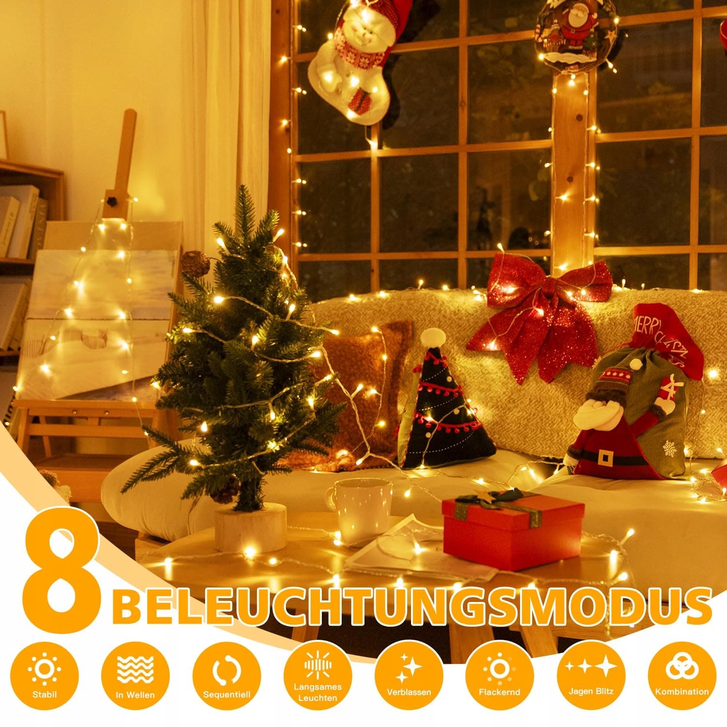 8 trybów: Led Lichterkette zewnętrzna z 8 trybami oświetlenia, od ciągłego po migający, możesz łatwo stworzyć fascynującą atmosferę na każdą okazję; Dzięki adapterowi lub pilotowi można łatwo ustawić różne efekty