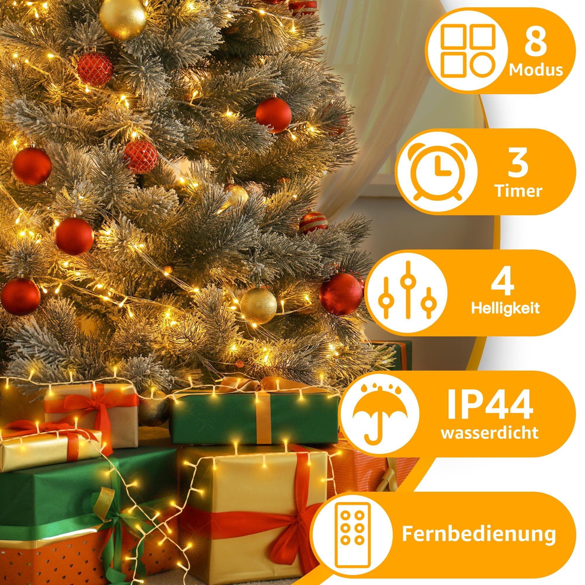 IP44 wodoodporna i bezpieczna: Lichterkette na choinkę wytrzymuje lekki deszcz i wilgoć; Wprowadza światło w wilgotne poranki i pochmurne deszczowe dni; Z napięciem 31 V, energooszczędna; (Proszę trzymać adapter z dala od wody)