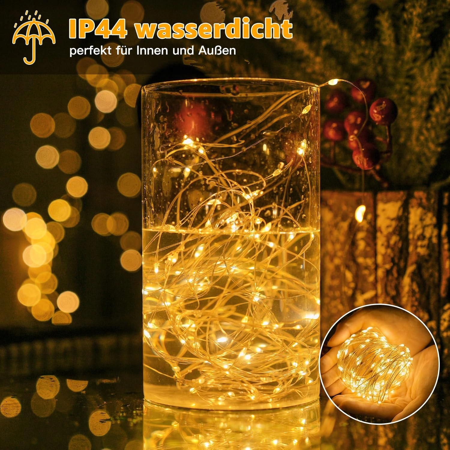 Bezpieczne w dotyku: Oświetlenie świąteczne wewnętrzne z baterią z diodami LED o niskiej temperaturze i izolowanym miedzianym drutem, ta Lichterkette jest bezpieczna w użyciu i dotyku; IP44 wodoodporna, odpowiednia do dekoracji na zewnątrz, takich jak taras, ogród, okna itp.