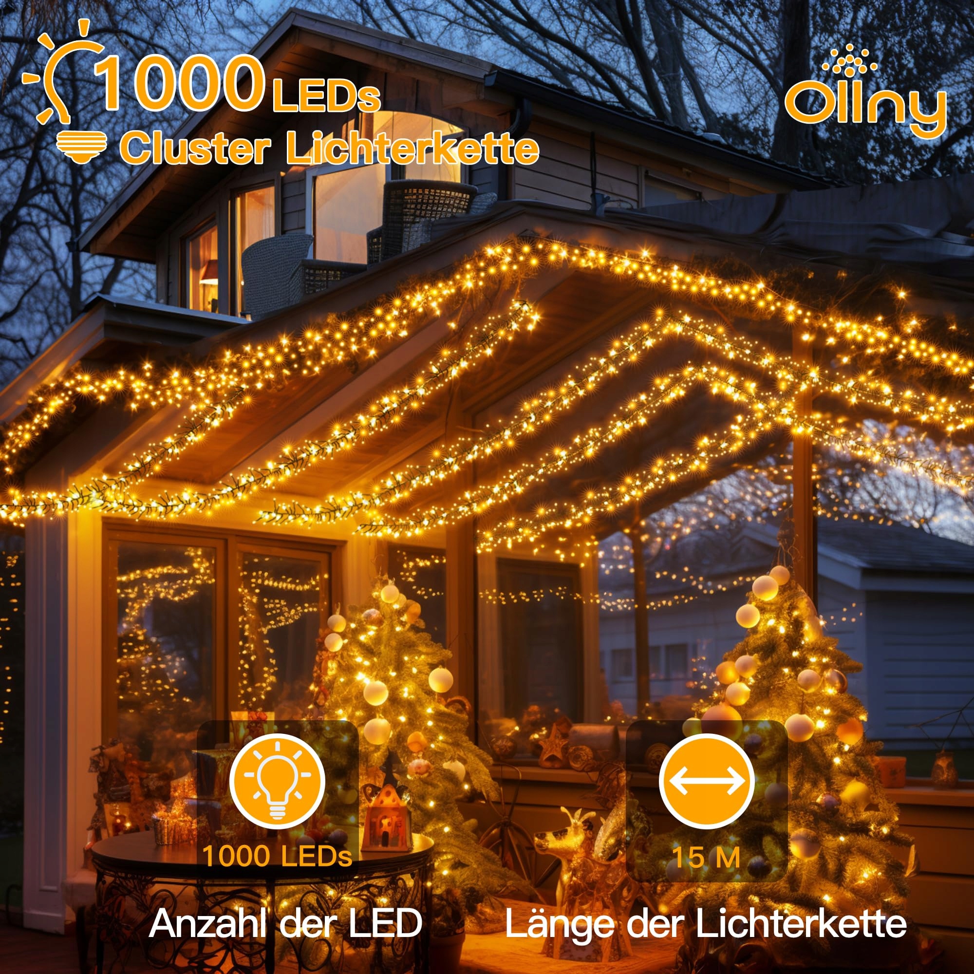 Ollny 15m Lichterkette außen 1000 LED, Lichterketten z 8 trybami i timerem, Cluster Lichterkette IP44 wodoodporna z wtyczką, do choinki na Boże Narodzenie, wesela, imprezy (ciepła biel)