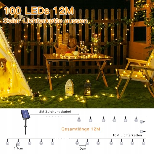 Ollny Solar Lichterkette Aussen wetterfest 12M 100 LED, IP65 wodoodporny Lichterkette Außen Solar z 8 trybami, Solar Lichterkette Outdoor do ogrodu tarasu balkonu ślubu (Ciepły biały)
