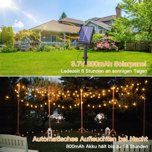 Solarny łańcuch świetlny na zewnątrz, odporny na warunki atmosferyczne: Panele słoneczne są wodoodporne zgodnie z normą IP65 i wytrzymują wszystkie warunki pogodowe. Zewnętrzny łańcuch świetlny LED jest wodoodporny zgodnie z normą IP44 i wytrzymuje lekki deszcz i wilgoć