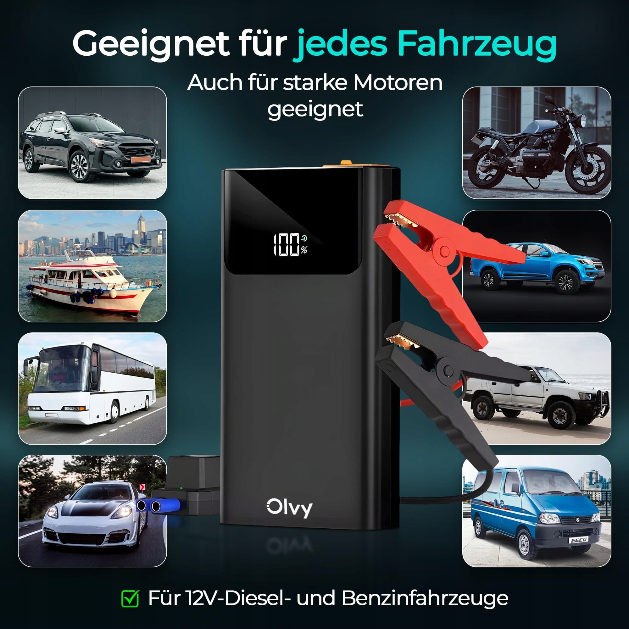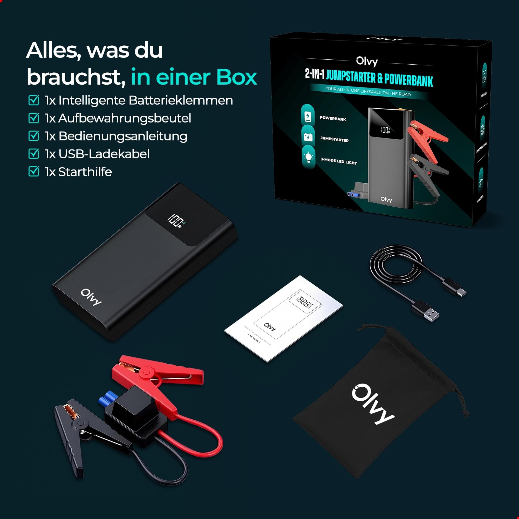 Olvy Urządzenie rozruchowe 2 w 1 i powerbank 1500 A, 12 V Latarka LED | Premium Supply