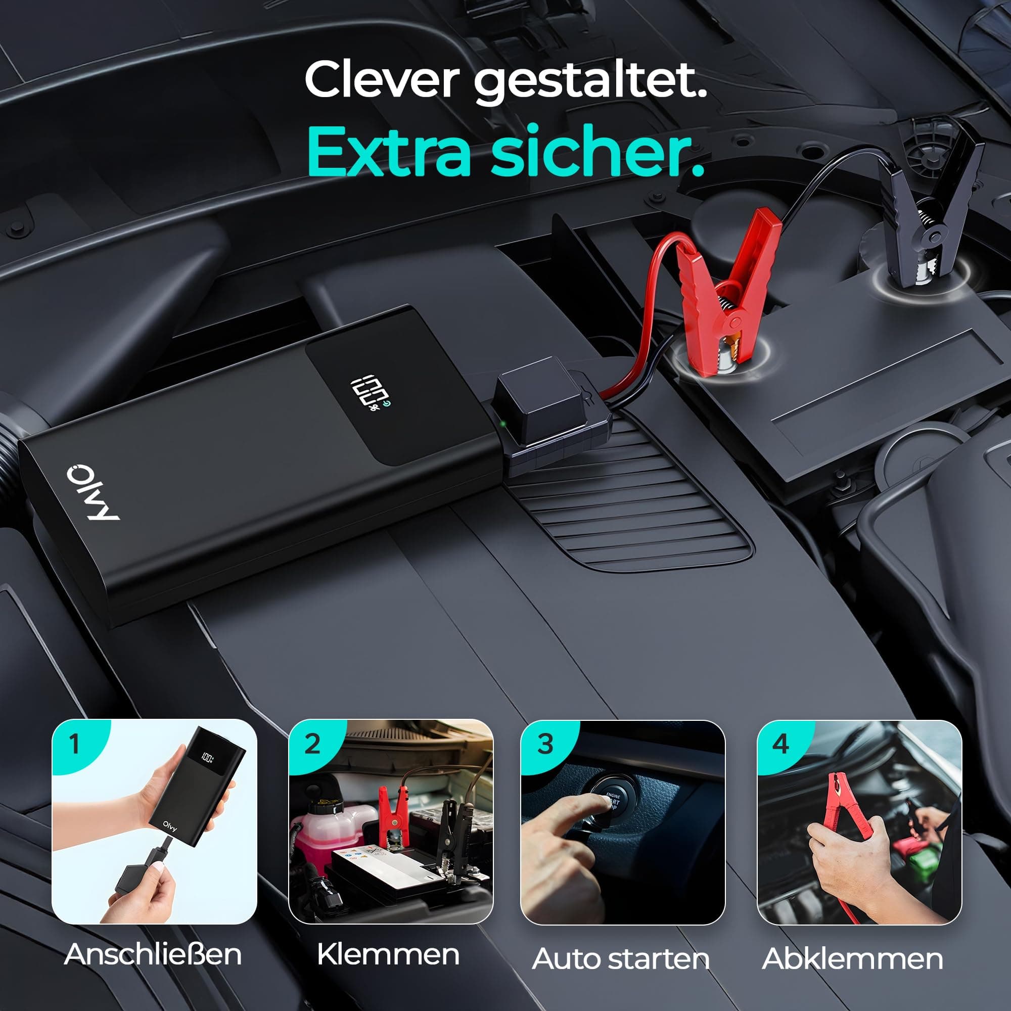 Olvy 2-w-1 rozruch i powerbank – 1500A prąd szczytowy, 12V przenośny booster akumulatora samochodowego z inteligentnymi zaciskami, latarka LED, wyjście USB/Type-C, dla samochodów, ciężarówek, motocykli, łodzi, SUV-ów