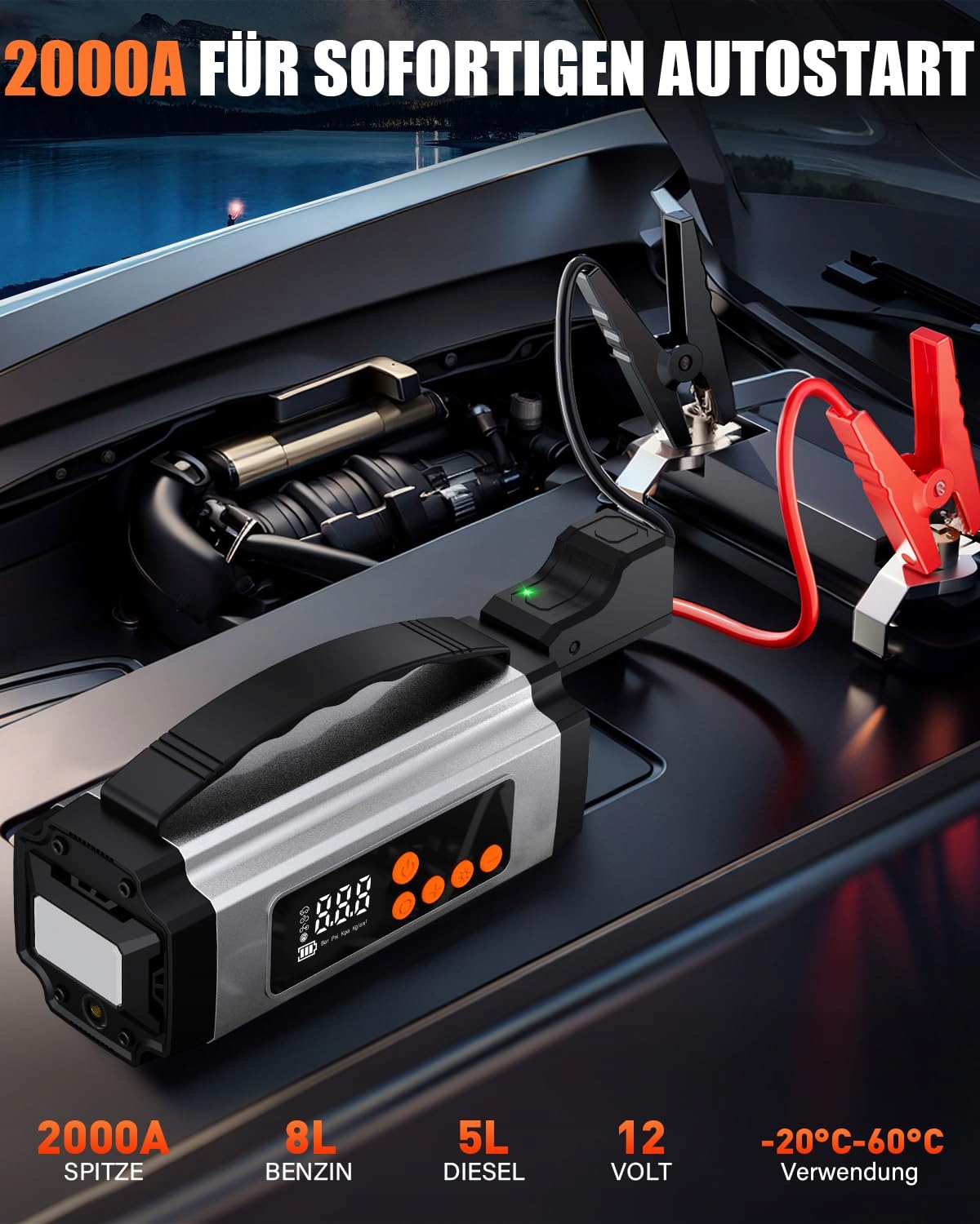 2000A POWERBANK DO ROZRUCHU SAMOCHODU: Prąd 2000A dla szybkiego startu wszystkich samochodów i dla silników benzynowych do 8L oraz diesla do 5L, takich jak samochody osobowe, SUVy, furgonetki, motocykle, łodzie, śnieżne skutery, kosiarki, kampery, jachty itp.