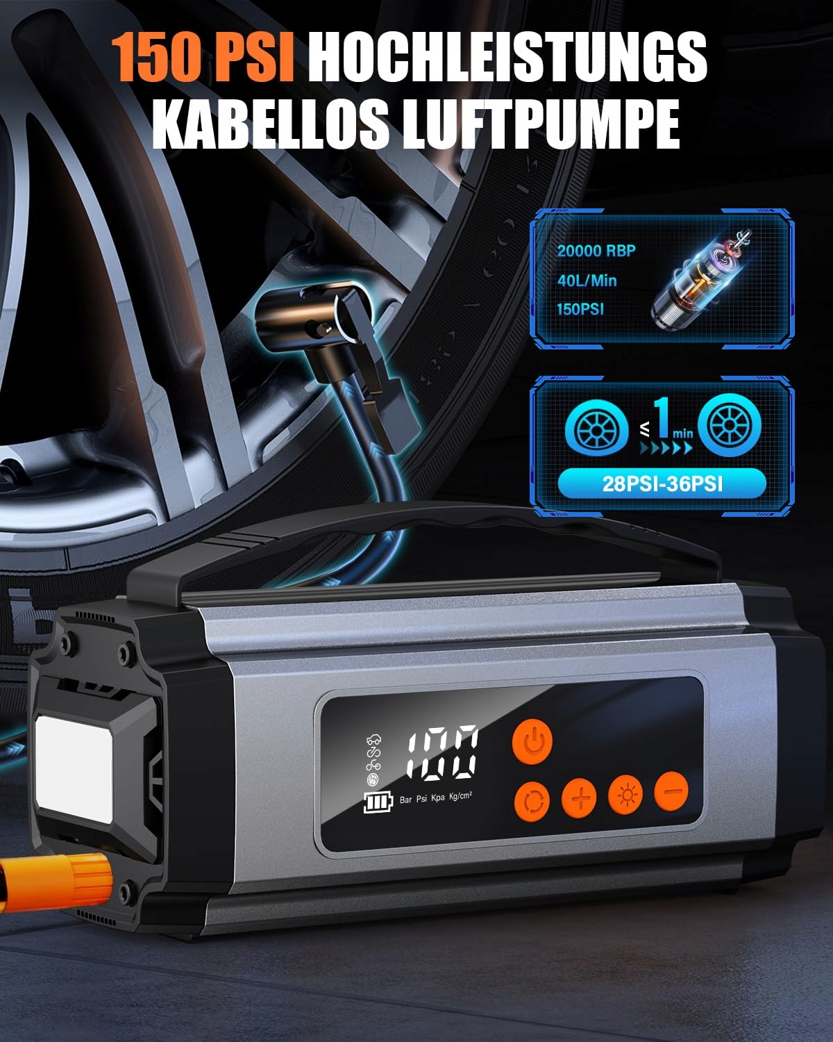 150 PSI KOMPRESOR: Wbudowany kompresor wysokiej wydajności napełnia opony samochodowe w minutach od 0 do 2.5 bara. 5 trybów napełniania (auto, motocykl, rower, piłka, niestandardowy), 4 jednostki ciśnienia (PSI, BAR, KPA, Kg/CM²). Automatyczne wyłączanie po osiągnięciu docelowego ciśnienia. 4 dodatkowe końcówki do opon, piłek, materacy powietrznych, zabawek wodnych.