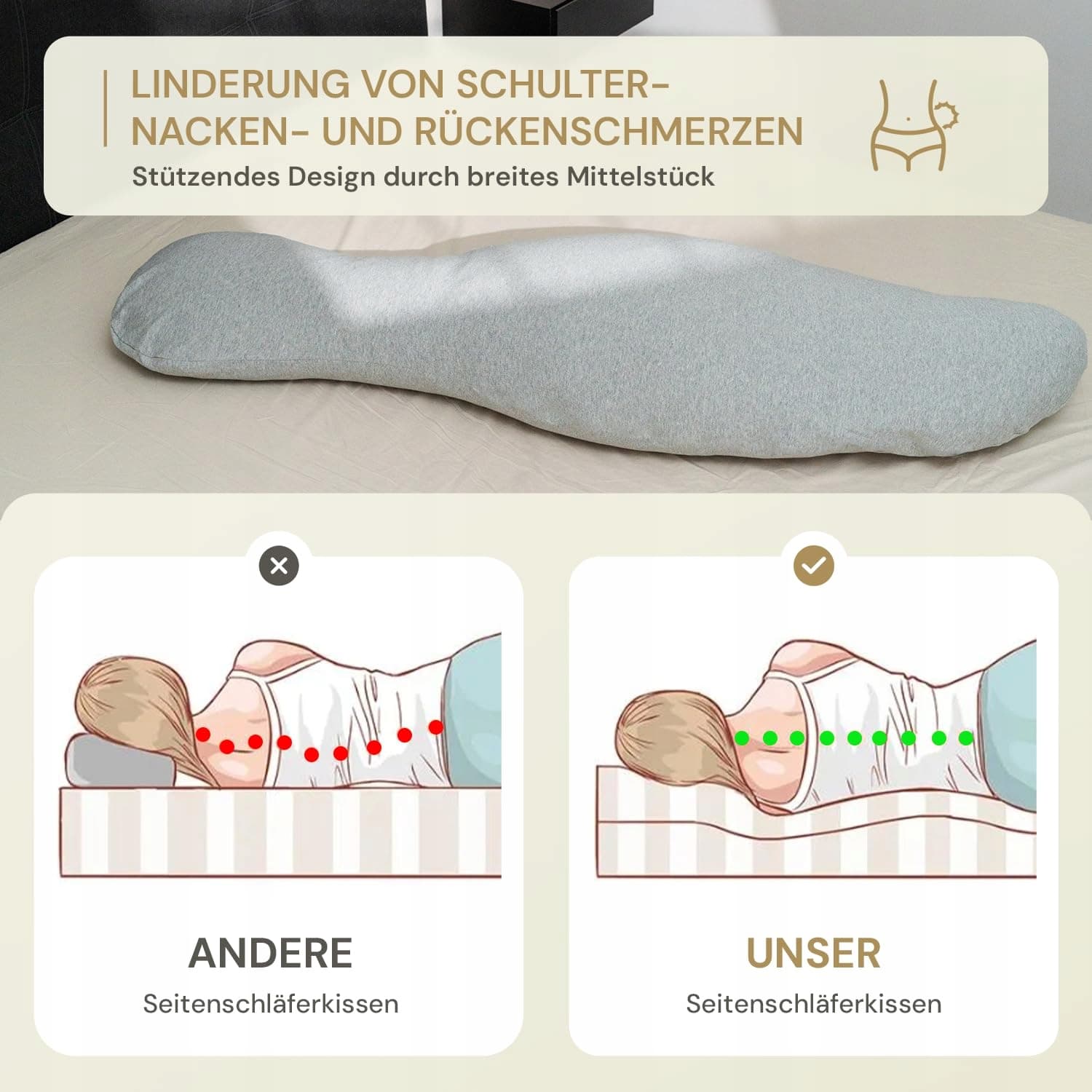 ✅ KSZTAŁT CIAŁA DLA PRZYTULNEGO KOMFORTU – Poduszka dla śpiących na boku ma unikalny, przypominający ludzką sylwetkę kształt, który zapewnia wyjątkowe poczucie bezpieczeństwa i przytulności – idealna na spokojne noce i poczucie ochrony.