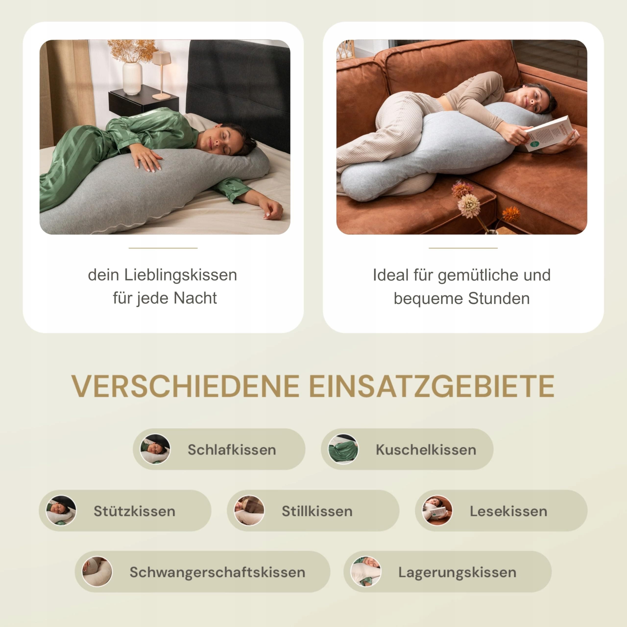 ✅ IDEALNA DLA KOBIET W CIĄŻY – Ta poduszka to doskonały towarzysz dla przyszłych mam, ponieważ podtrzymuje brzuch i umożliwia wygodne ułożenie się na boku – dla większego komfortu snu w czasie ciąży.