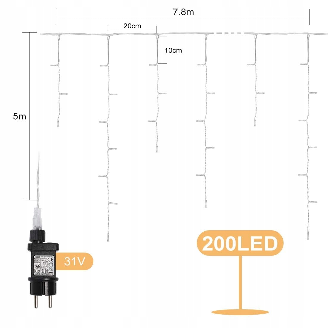 [200 LED Lichterkette]: Całkowita długość: 12.8M, 7.8 metra łańcucha świetlnego + 5 metrów kabla zasilającego. Ilość LED: 200 LED. Odległość między LED: 10cm. Po 4 pasma z 3–7–4–6 LED, łącznie 40 pasm.