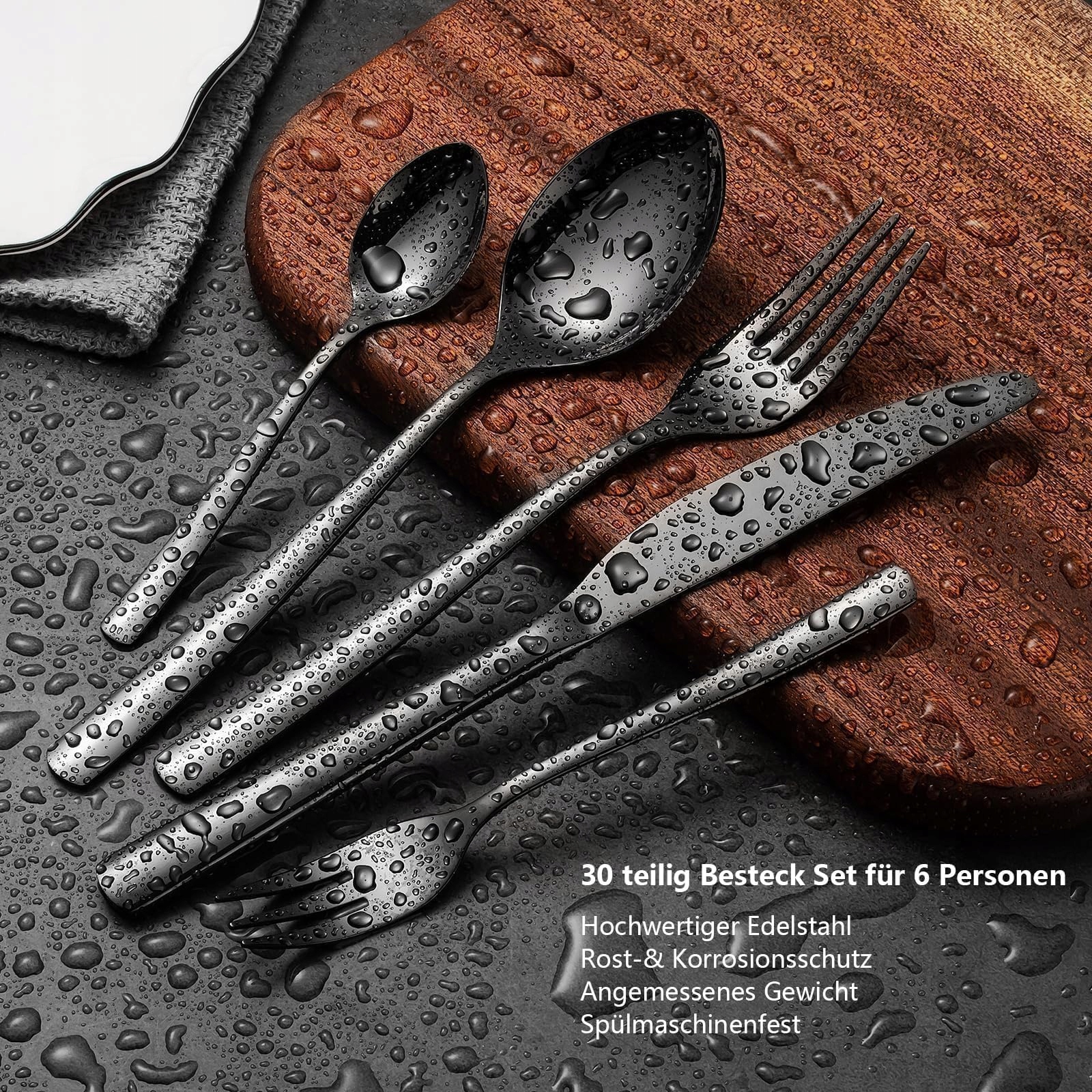 【Zestaw 30-częściowy z 6 sztućcami】: 30-częściowy czarny zestaw sztućców Opolia obejmuje 6 widelców, 6 łyżek, 6 widelczyków do sałatek, 6 łyżeczek i 6 noży, cały zestaw jest idealny na rodzinne obiady lub formalne okazje