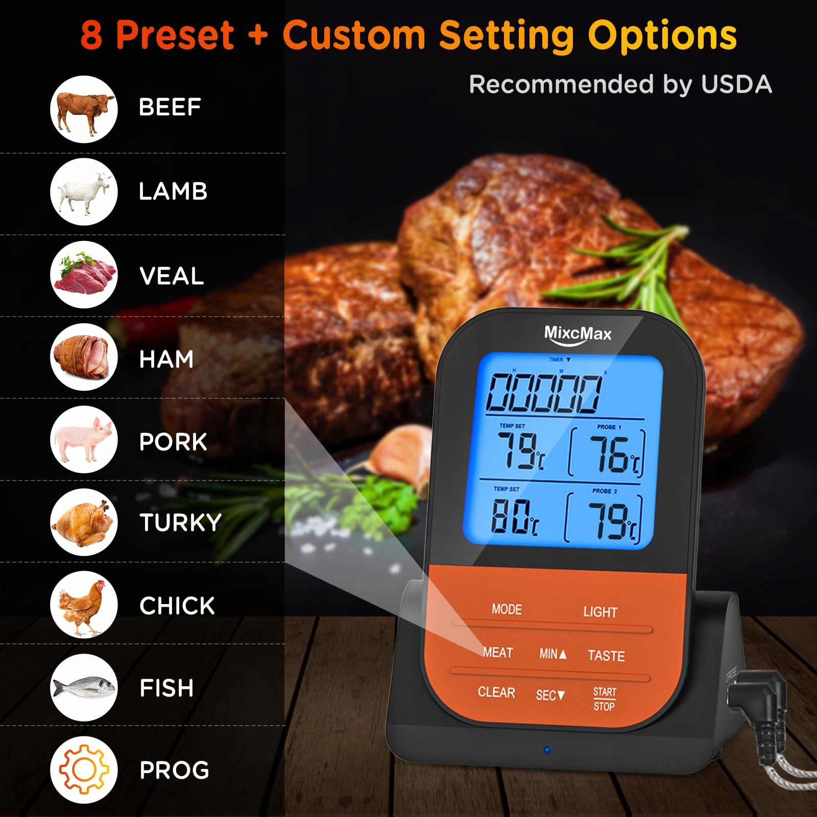 Super termometr do mięsa: Jak chciałbyś, aby Twoje danie było przygotowane? 5 poziomów gotowości, 8 rodzajów mięsa: Well-Done, Med Well-70 procent, Medium-Półkrwisty, Med Rare-lekkie krwiste, Rare-Krwisty; BEEF-wołowina, LAMB-jagnięcina, VEAL-cielęcina, HAM-szynka, PORK-wieprzowina, TURKY-indyk, CHICK-kurczak, FISH-ryba, PROG-tryb użytkownika