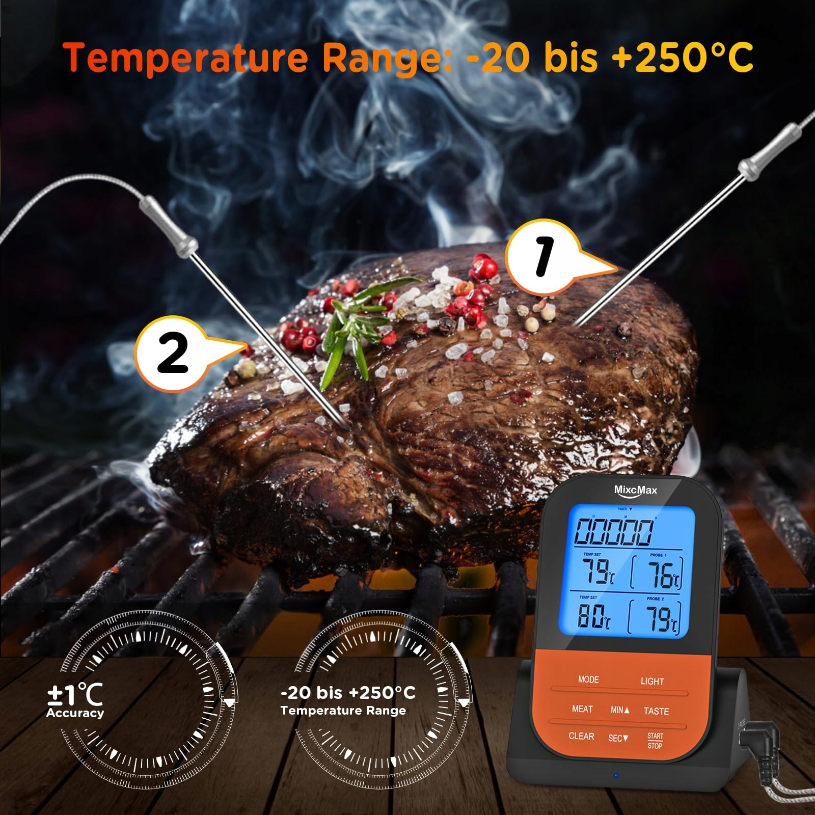 2 czujniki temperatury i kabel czujnika temperatury ze stali nierdzewnej o długości około 100 cm: Dla optymalnej przyjemności w grillowaniu w wędzarni BBQ lub grillu kulowym zaleca się bezprzewodowy termometr do mięsa z co najmniej dwoma czujnikami temperatury, dzięki czemu możesz sprawdzić i ewentualnie zmienić mięso i temperaturę na przykład w wędzarni BBQ. Ponadto możliwe jest jednoczesne sprawdzenie dwóch różnych rodzajów mięsa za pomocą dwóch czujników temperatury