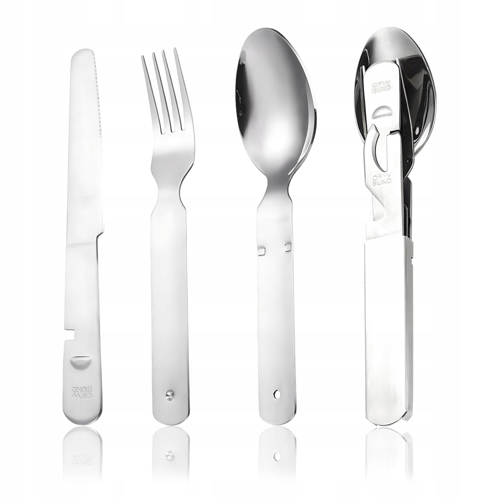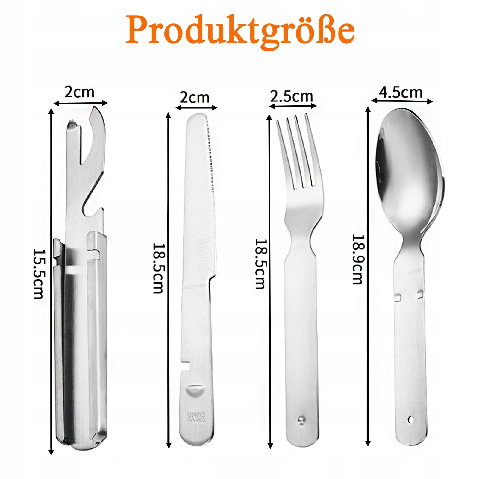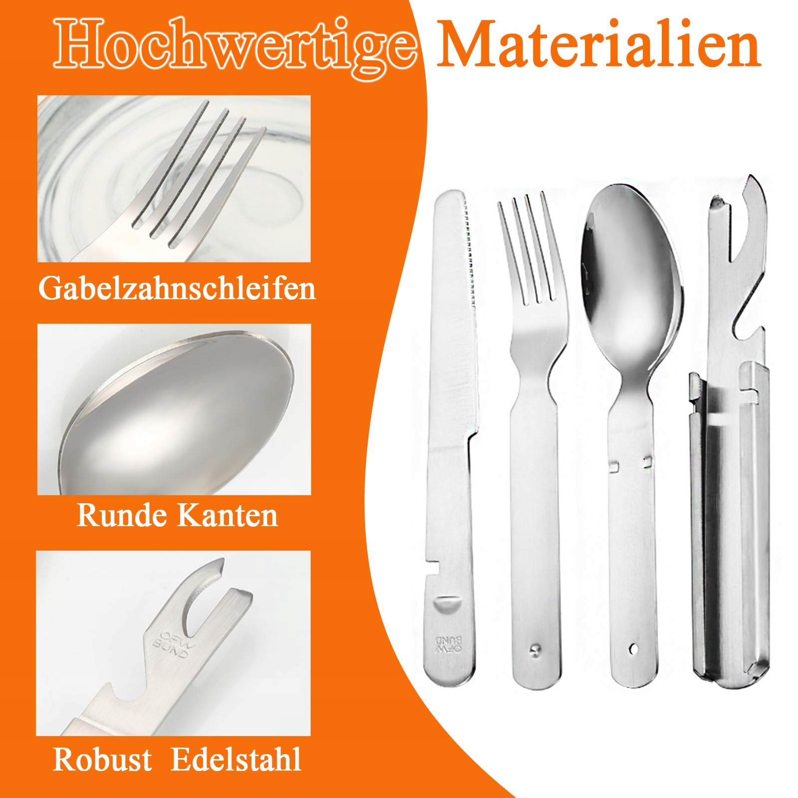 Wszechstronny i praktyczny - 1x 4-częściowy zestaw sztućców z nożem, widelcem, łyżką i otwieraczem do butelek, wszystko masz pod ręką. Zestaw turystyczny jako popularny zestaw sztućców jest cennym towarzyszem podczas wędkowania, polowania, kempingu, trekkingu lub wędrówek.