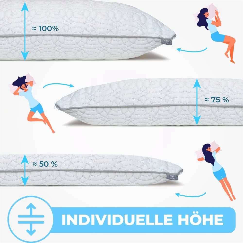 Indywidualna wysokość i twardość: Dzięki regulowanemu wypełnieniu poduszki, poduszka z pianki pamięciowej jest idealna dla osób śpiących na boku, brzuchu i plecach. Wypełnienie poduszki ortopedycznej można łatwo usunąć, aby samodzielnie skonfigurować wysokość. Zalecamy poświęcenie kilku dni na ustalenie wysokości, która najlepiej odpowiada Twoim osobistym nawykom snu. Możesz określić wysokość i twardość poduszki, usuwając lub dodając małe kawałki pianki pamięciowej (80%) i mieszanki mikrofibry (20%).