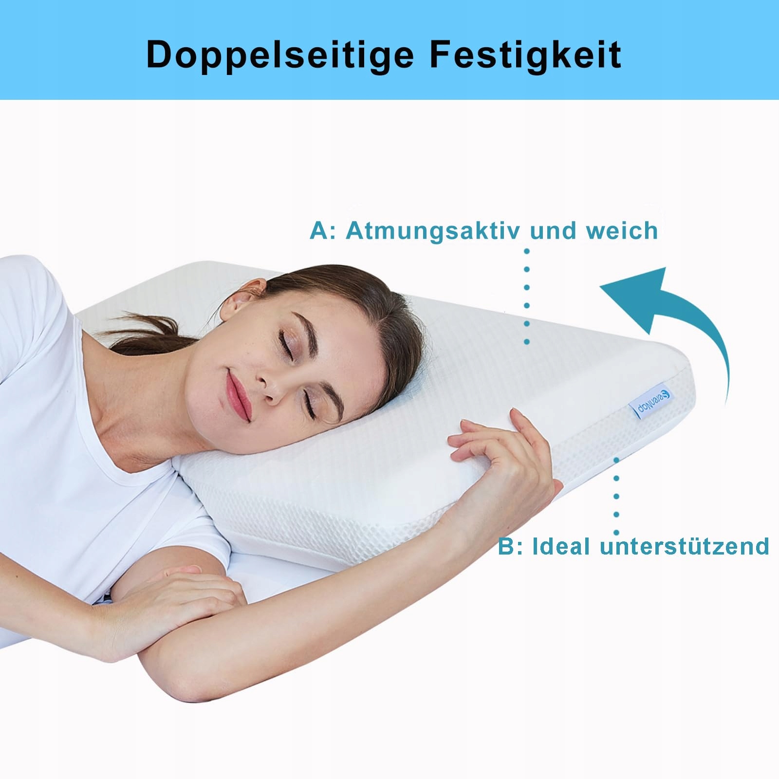 【Dwustronna twardość】Miękka czy średnio twarda? Ty decydujesz! Z jednej strony poduszka ma rowkowane nacięcia dla przytulnego komfortu i wentylacji, a z drugiej strony zapewnia mocniejsze wsparcie, dzięki czemu dopasowuje się do Twoich potrzeb podczas snu. Ciesz się idealną równowagą między miękkością a wsparciem