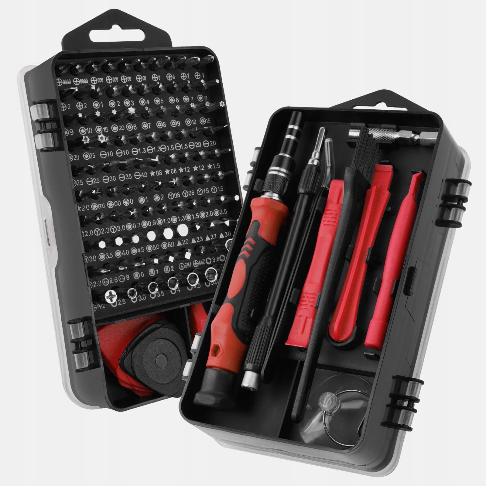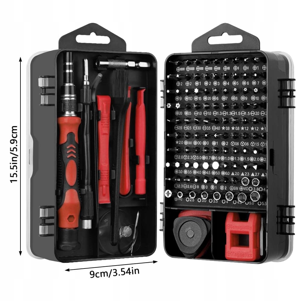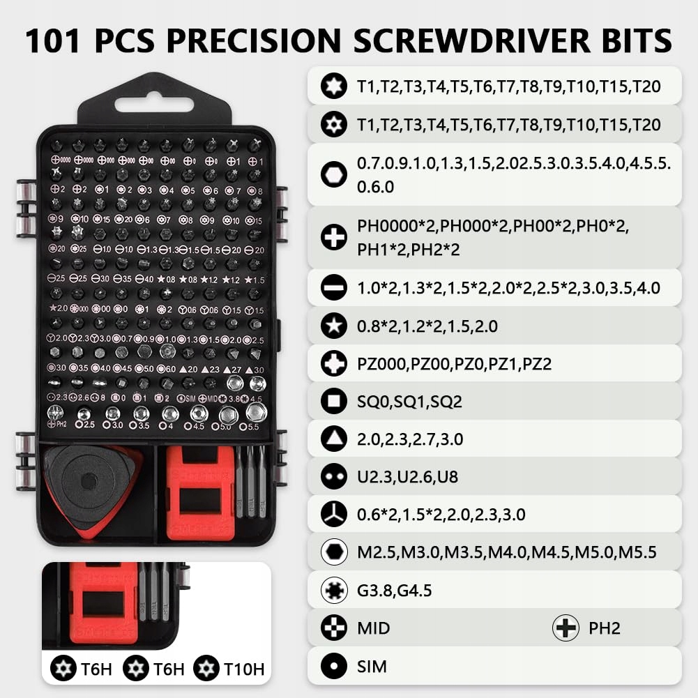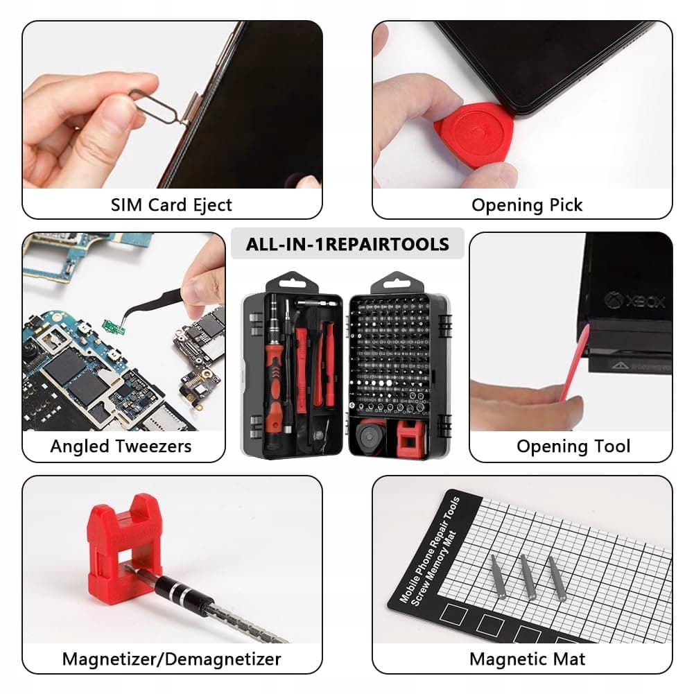 Wielofunkcyjny zestaw: Zestaw precyzyjnych wkrętaków 124 w 1 zawiera 101 końcówek wkrętaków o średnicy 4 mm (Torx, krzyżakowe, płaskie, trójkątne, sześciokątne itd.) oraz 23 inne narzędzia, w tym twarde i miękkie przedłużki, narzędzia dźwigowe, specjalne narzędzia wkładane i przyssawki. Wyposażony w antystatyczne pęsety, wyzwalacz karty SIM, szczotkę do czyszczenia, ściereczkę do czyszczenia, antypoślizgową rączkę silikonową i podkładkę magnetyczną itd.
