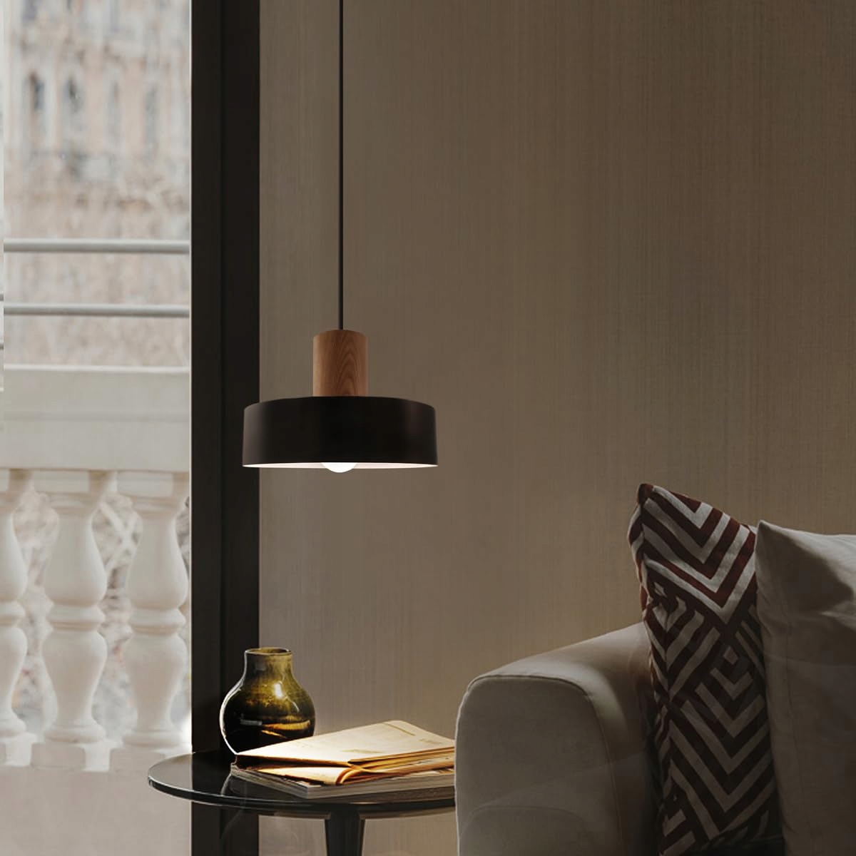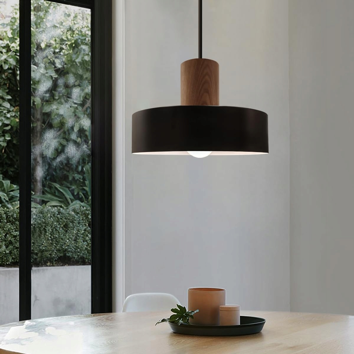 Lampa wisząca z drewna, czarna lampa wisząca 1-płomienna, klosz aluminiowy Ø25cm, duża lampa kuchenna w stylu vintage, przemysłowa lampa E27 do jadalni, sypialni, lampka nocna, lampa wisząca do salonu