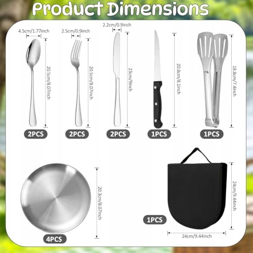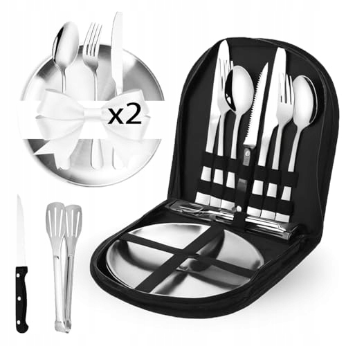 Zestaw naczyń kempingowych: Ten przenośny zestaw sztućców kempingowych dla 2 osób został zaprojektowany tak, aby spełniać wszystkie Twoje potrzeby podczas jedzenia na świeżym powietrzu. Zestaw sztućców kempingowych składa się z 2 widelców, 2 łyżek, 2 noży stołowych, 1 noża do masła, 2 talerzy obiadowych, 1 klipsa do steków, 1 przenośnej torby do przechowywania oraz 1 otwieracza do butelek. Ten zestaw sztućców jest przeznaczony dla osób często podróżujących. Każde narzędzie ma własną przegródkę, dzięki czemu sztućce pozostają bezpieczne i stabilne podczas transportu.